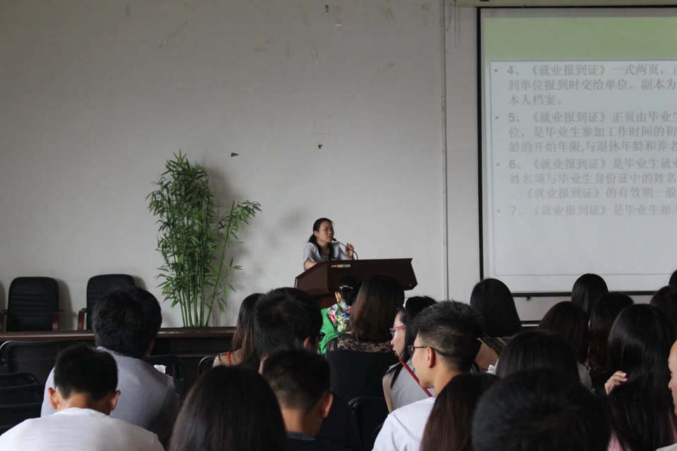 随后,禹云闪副院长针对办理毕业离校的相关手续,进行了细致地讲解、强调。例如省内外同学档案的名称区别,宿舍搬离手续如何交接等,旨在帮助毕业生能更文明、高效地完成各类事项。最后,辅导员王琳向四年相伴的大家表达谢意,真情总能打动人,同学们也自发地站立、鞠躬,并唱了一首张震岳的《再见》表达不舍。
