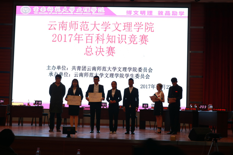 为提高大学生的综合素质,拓展大学生视野,丰富大学生活。由共青团云南师范大学文理学院委员会主办,云南师范大学文理学院学生委员会承办的百科知识竞赛总决赛于2017年11月23日星期四晚在杨林校区学生会堂举办。