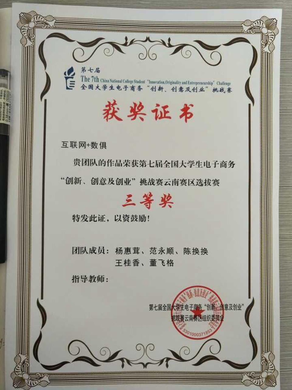 她利用假期开辅导班,给不同年级学生补课,学以致用,不仅提高自身的专业素养,还吸取经验,为以后自己当教师做铺垫,做到一举两得。不仅如此,还组队创业,曾荣获第二届“腾艺杯”校园策划优秀奖,“学致杯”优秀奖,个人职业生涯规划大赛一等奖及“云南启迪杯”第二届云南省“互联网+”大学生创新创业大赛创意组银奖。想拥有一份属于自己专业的创业,她又重新组队创业,现正在学校的梦工厂创业“互联网+数俱”。