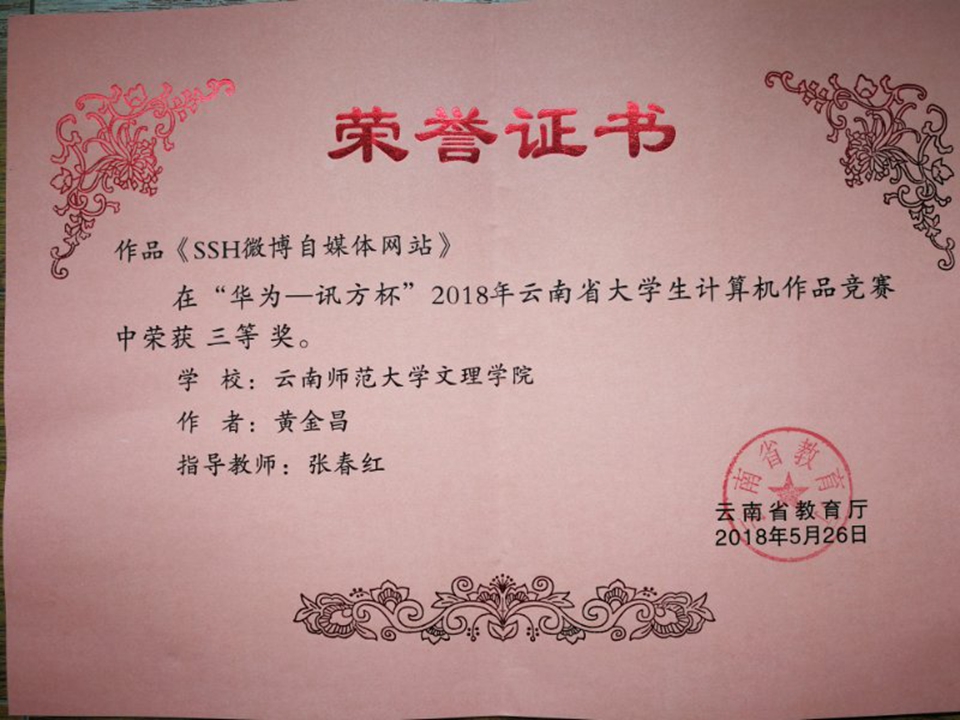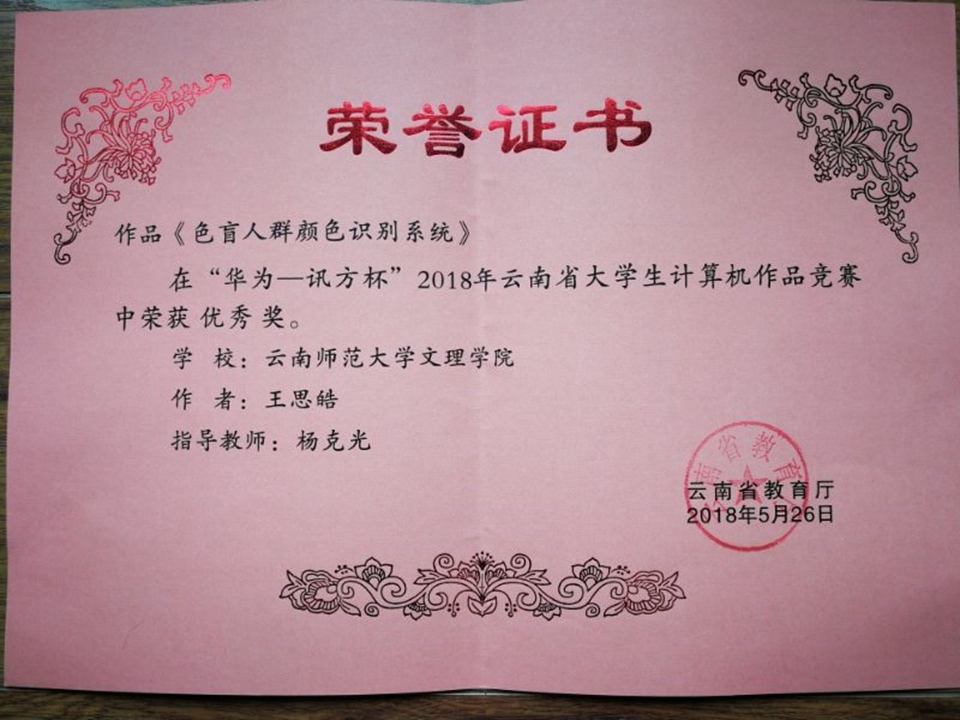 由云南省教育厅、云南省科协主办,云南省计算机学会与曲靖师范学院共同承办,华为技术有限公司和深圳讯方技术股份有限公司联合协办的2018年云南省大学生计算机作品赛,于2018年5月25日至5月26日在曲靖师范学院成功举行。我院推荐2项作品参加比赛。竞赛前省内39所高校在“竞赛云平台”上提交了737件计算机作品。其中有20所本科高校,10所专科学校,共30所高校,64个作品参加了本次竞赛。