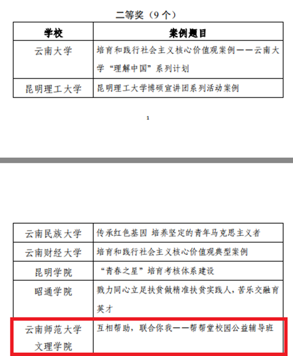 中共云南省委高校工委【2018】27号文件公布了云南省高校培育和践行社会主义核心价值观优秀案例评选结果,评选出一等奖5个,二等奖9个,三等奖15个。我院帮帮堂校园公益辅导班荣获二等奖。