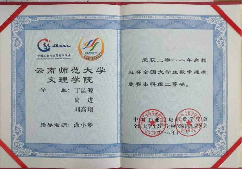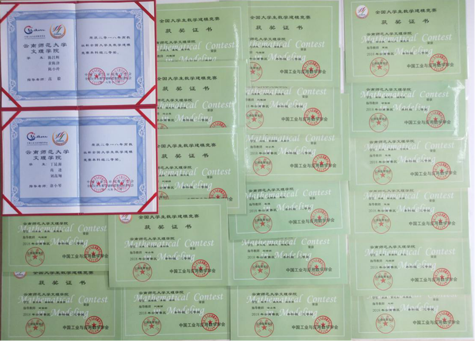 全国大学生数学建模竞赛是由教育部高等教育司和中国工业与应用数学学会共同主办,是目前全国高校规模和影响力最大的基础性学科竞赛之一。经精心组织,信息工程学院38支参赛队报名参赛,是历年来参赛人数最多的一次。经2018年9月13日至9月16日激烈角逐后,成绩已揭晓,信息工程学院在本次数学建模赛中取得优异成绩,21个队获奖,占参赛人数的55.26%,其中2队获得全国二等奖,3队获得云南省一等奖,9队获得云南省二等奖,7队获得云南省三等奖。