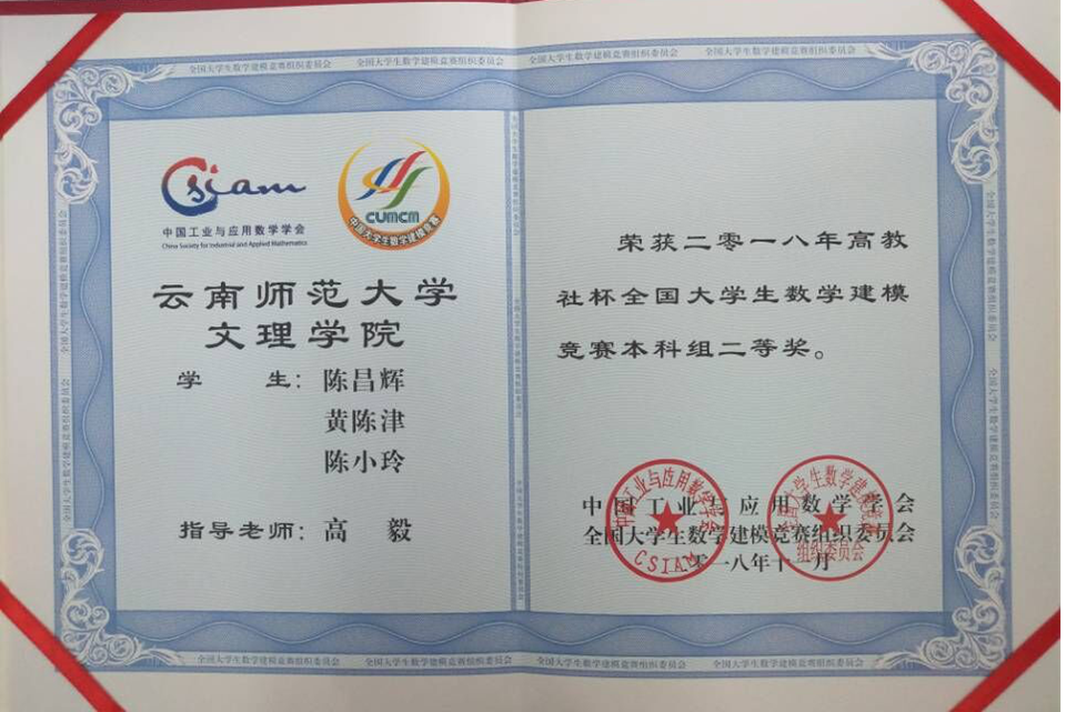 陈昌辉、黄陈津、陈小玲(2016级数学与应用数学专业)获全国本科组二等奖
