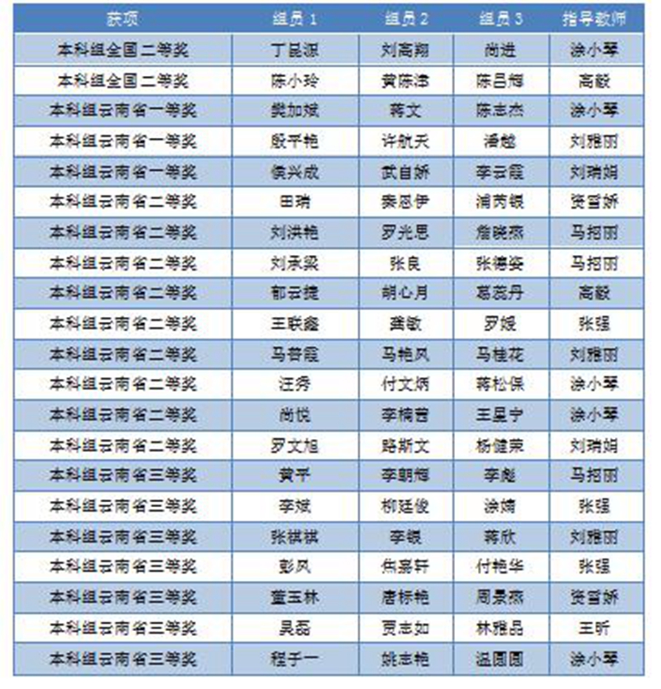 2队获得全国二等奖,3队获得云南省一等奖,9队获得云南省二等奖,7队获得云南省三等奖