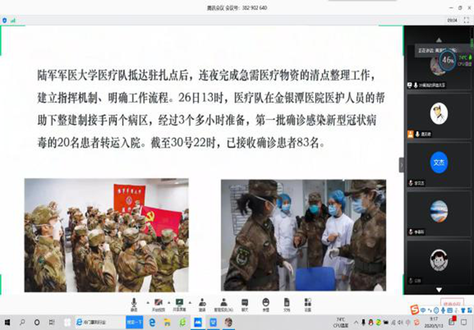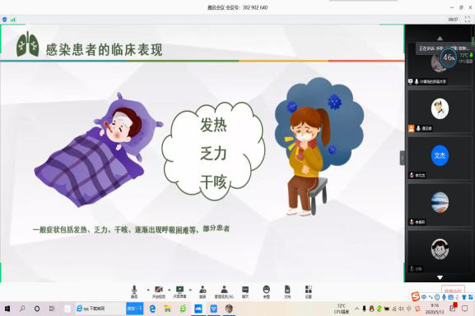 2020年5月13日,2019级数学与应用数学F班团支部在2020年5月13日早上通过腾讯会议开展了“绽放战疫青春,坚定制度自信”的主题团日活动,团日活动开始,全班齐唱团歌,之后带同学们了解了防疫小知识。