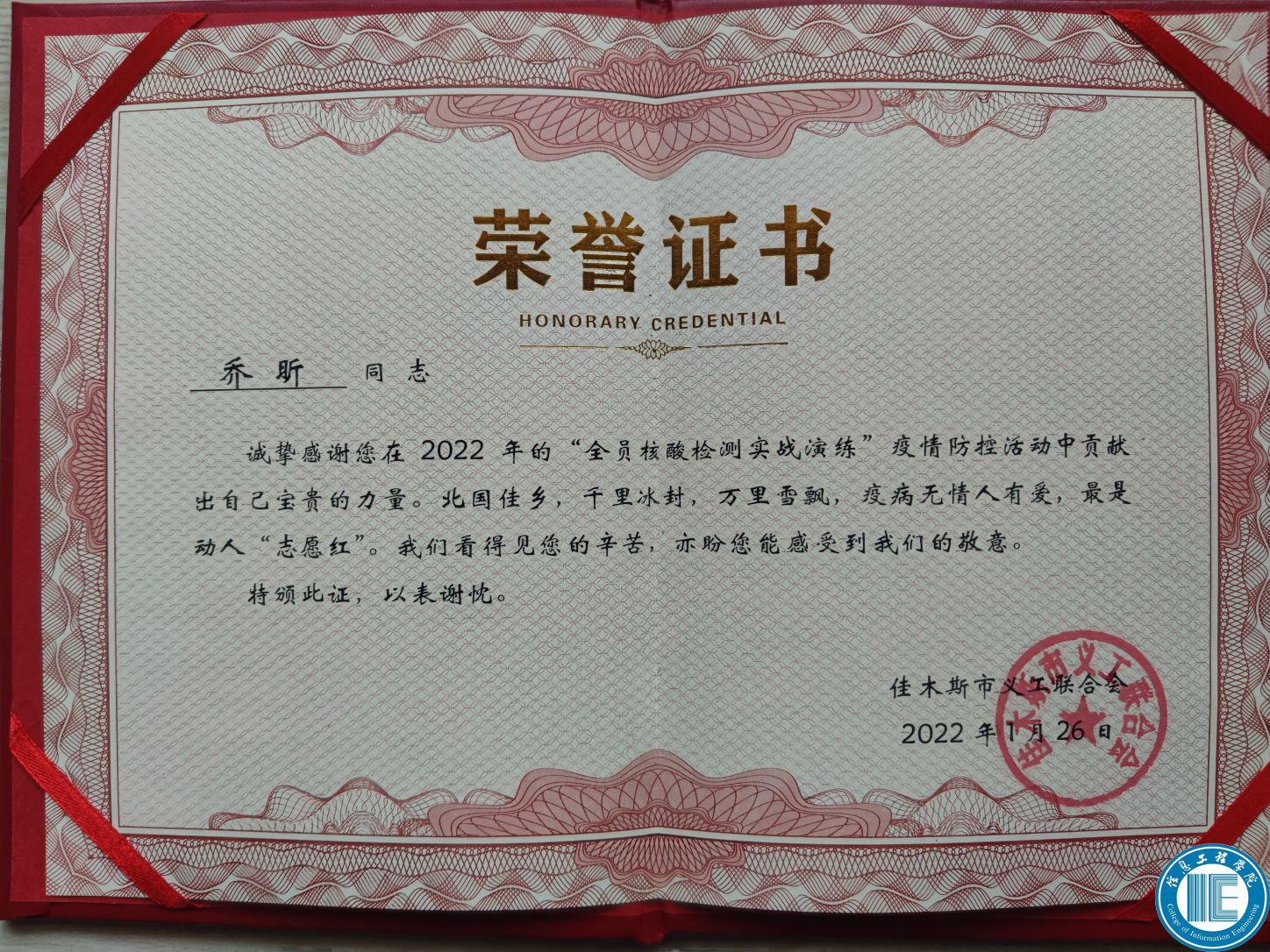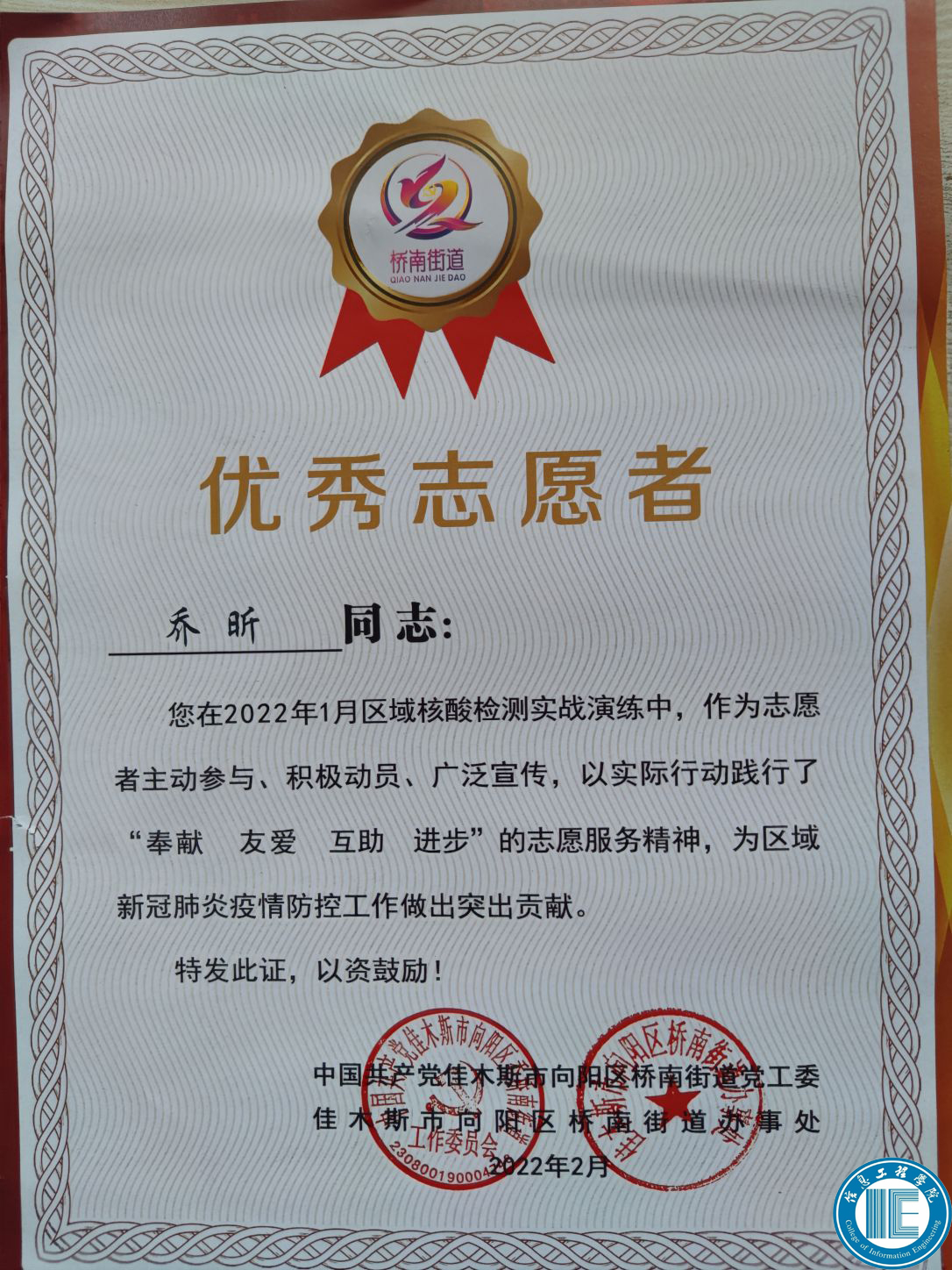 信息工程学院19数F班的乔昕,为响应佳木斯市义工联合会的号召,保障全市人民身体健康和生命安全,确保全市人民度过一个安全的新春佳节,参加了市指挥部集中组织开展的全员核酸检测实战演练。早上五点半的佳木斯还是在零下二十左右度,乔昕同学就戴上工作牌出发工作。即使在严寒中工作长达十四个小时,义工队里却没有一个人抱怨,天寒地冻也不影响他们积极投身到疫情防控志愿服务中去。主动配合相关部门开展扫码、测温等工作。在现场维护秩序、关注居民情绪波动,为群众答疑解惑以确保全民核酸工作快速顺利的进行,充分发扬了“奉献、友爱、互助、进步”的志愿服务精神。