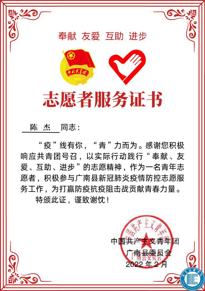 陈杰,一名大三在校生,在寒假疫情防控期间,他和另外五名大学生一起加入了黑支果志愿者团队。在村干部的领导下,他们在主要十字路口值守,对村内来往车辆和人员进行登记排查并测量体温。他们为村民们发放抗击疫情宣传单,主动承担讲解工作,为村民们讲解此次疫情带来的危害,帮助村委会人员录入各村人员所打疫苗凭证,确保每个符合接种条件的人员都及时接种疫苗。此外,他还加入了云南省青年志愿者协会和抗疫网宣志愿者协会,并积极转发疫情期间相关防护知识以及优秀感人事迹,与抗疫网宣志愿者的小伙伴们制作了大量公益宣传作品,以此来鼓励身边的人共同抗疫。