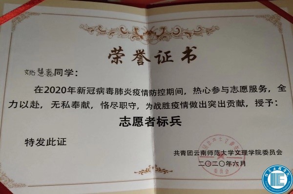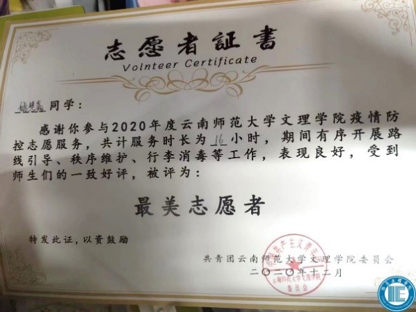 胡雪玲,现昆明文理学院信息工程学院一名大二在校生。她说道,作为一名大学生,她深知自己的责任和义务,在保护自己的同时,应该尽己所能、做力所能及之事,去帮助他人。因此,2021年7月,她积极响应乡政府的号召,并在村干部领导下,毅然加入大学生志愿者团队,为自己的家乡贡献一份力量。在十字路口进行值守以及对村内来往车辆进行登记和盘查,同时为村里外来人员进行信息登记并测量体温。2022年2月,她又拿起志愿者工作牌,服从村委会防疫志愿者安排,负责登记社区出入人员的基本信息,并按照规定统计省内外人员出入等工作。面对严寒天气,她说“冬天冰雪严寒,有时冻得实在受不了,想想疫情最前线的工作人员,垫垫脚跳一跳,就又燃起了斗志,继续努力工作。”