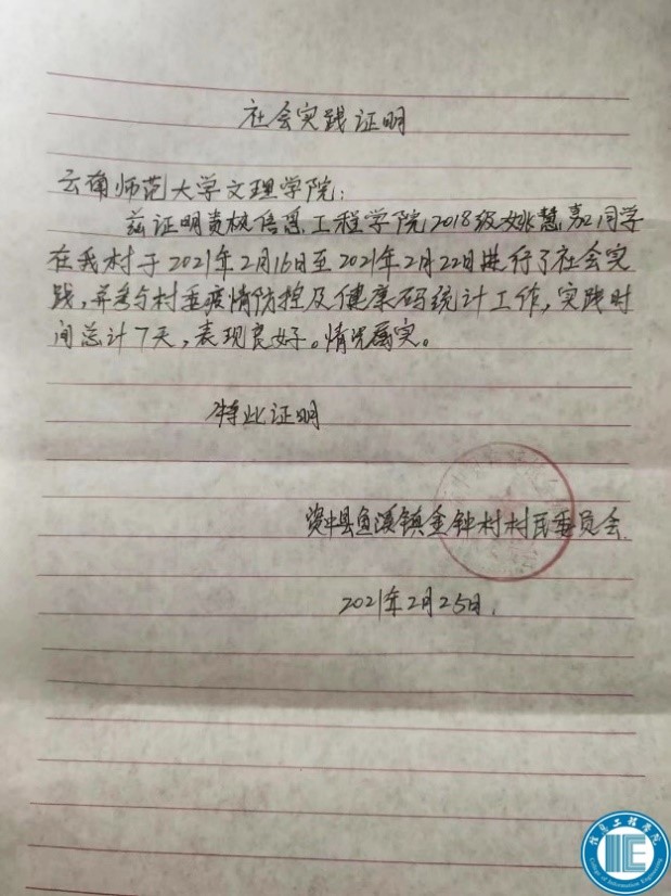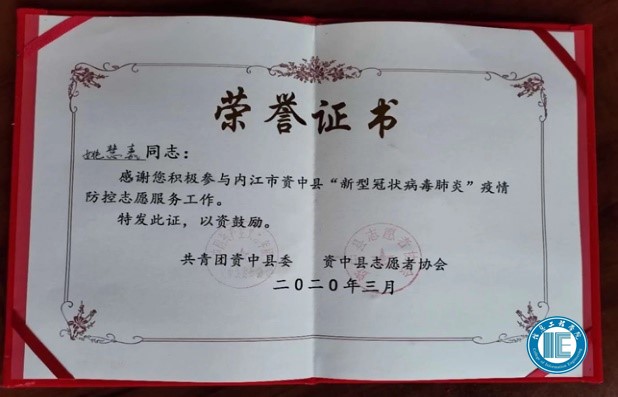 在2020年2月志愿者期间,姚慧嘉同学每天7点换班,中午回家吃饭休息2个小时,2点准时值班直至6点结束,她的主要工作是劝导居民少出门、登记出入居民的信息、在赶集的日子提醒村民们戴好口罩,注意防护。她也协助外出务工的人群填健康申报表,还做了宣传劝导、测量体温、讲解防疫知识的工作。在2021年春节,姚慧嘉同学回到家乡内江市资中县,继续参与抗疫志愿者防疫工作,主要工作是两码(健康码和行程码)的收集和分类,每个村分几个小队,每个小队建立一个文件夹,分批管理,保证上级领导方便查阅居民健康情况。