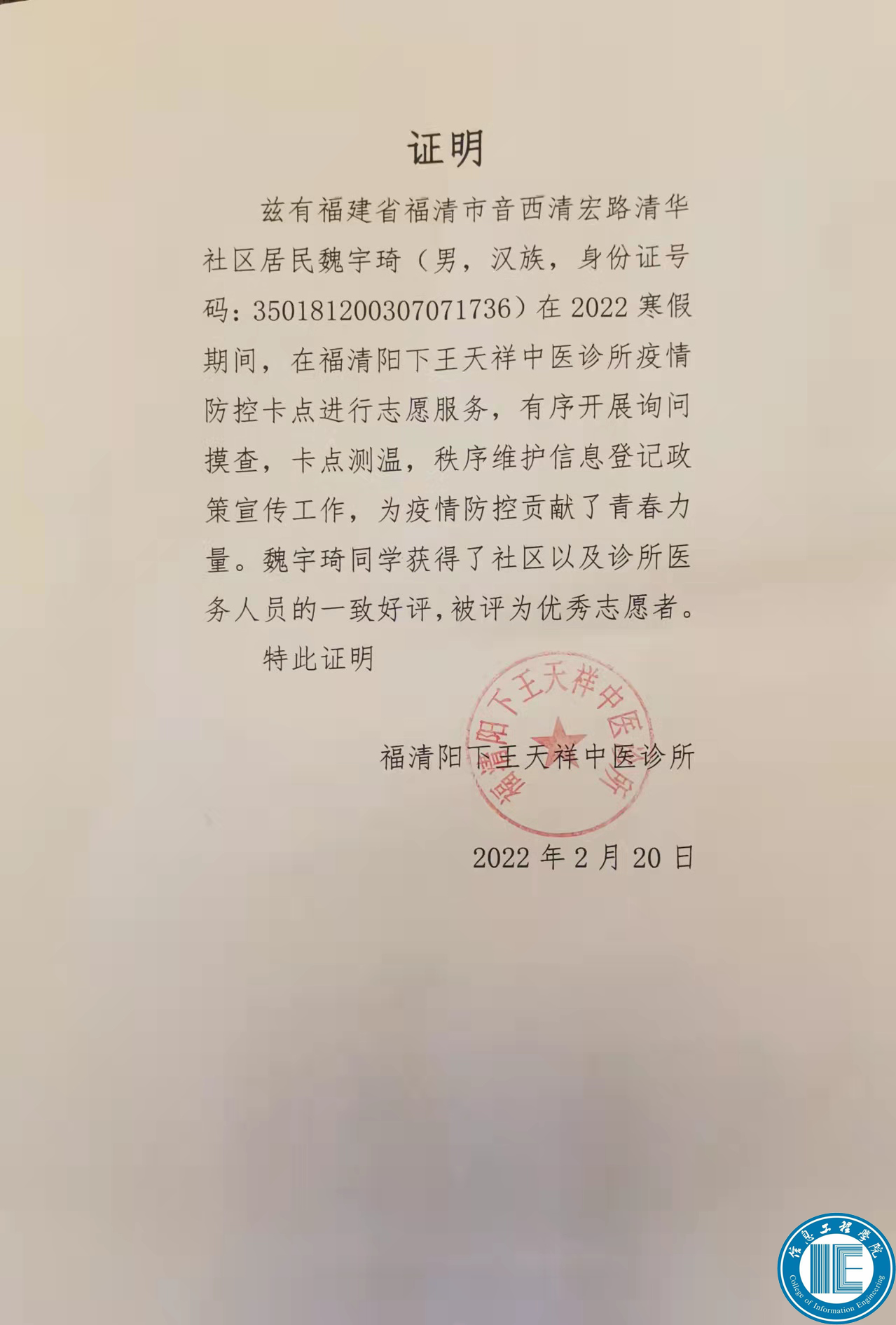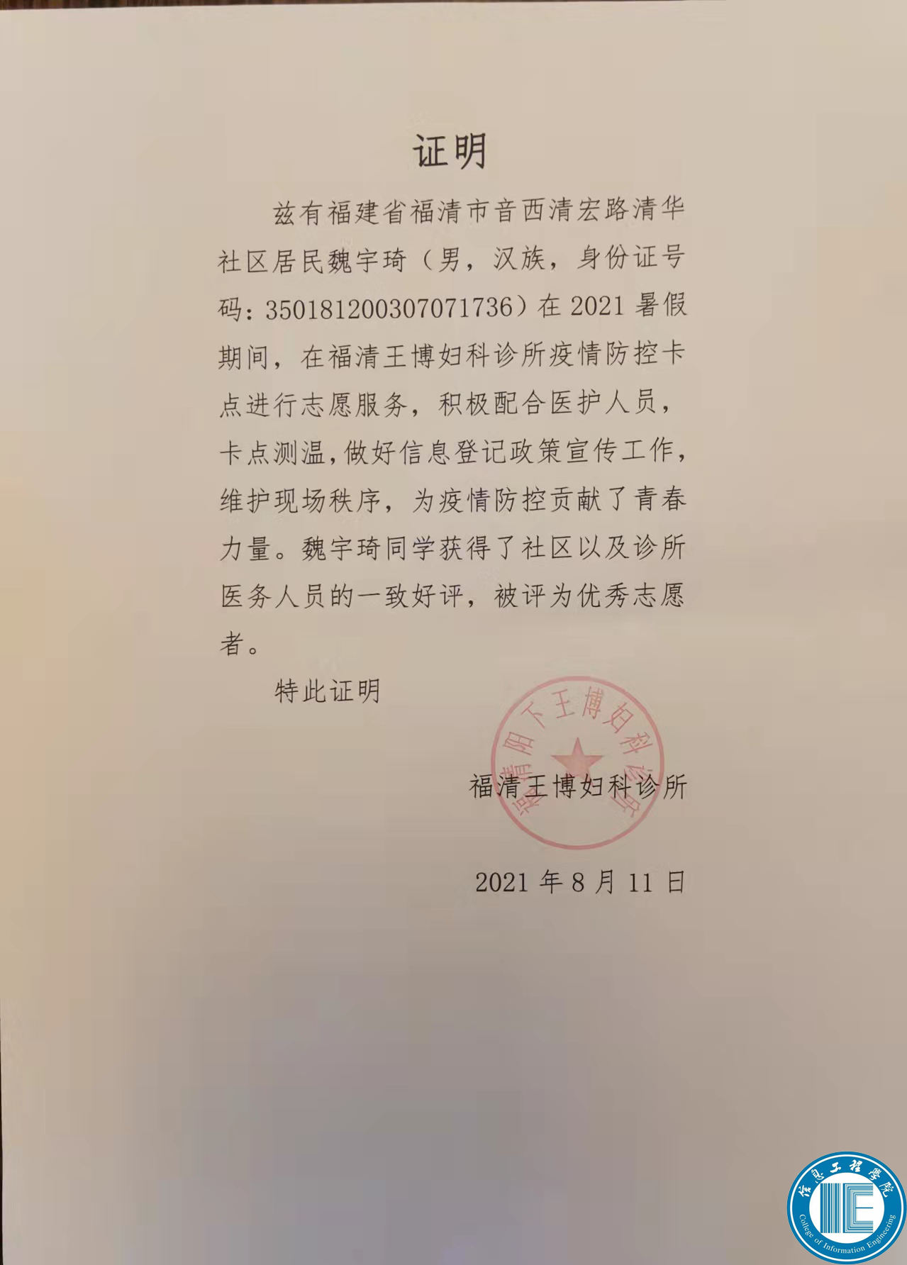 2021年7月,在清华社区的领导下,魏宇琦同学加入了大学生志愿者团队,在社区诊所进行值守。他的主要工作是为对社区路口来往车辆进行登记和盘查,及为诊所里外来人员进行信息登记并测量体温。此外,在医护人员的安排下,他在社区之中发放抗击疫情宣传单,提醒居民们家里若有从中高风险地区回来的人员一定要及时上报,并自我隔离14天。他们还为居民们讲解疫情带来的危害及病症的主要表现,也为居民们介绍了可能的感染途径及如何正确预防,并现场演示了正确洗手及正确佩戴口罩的方法。