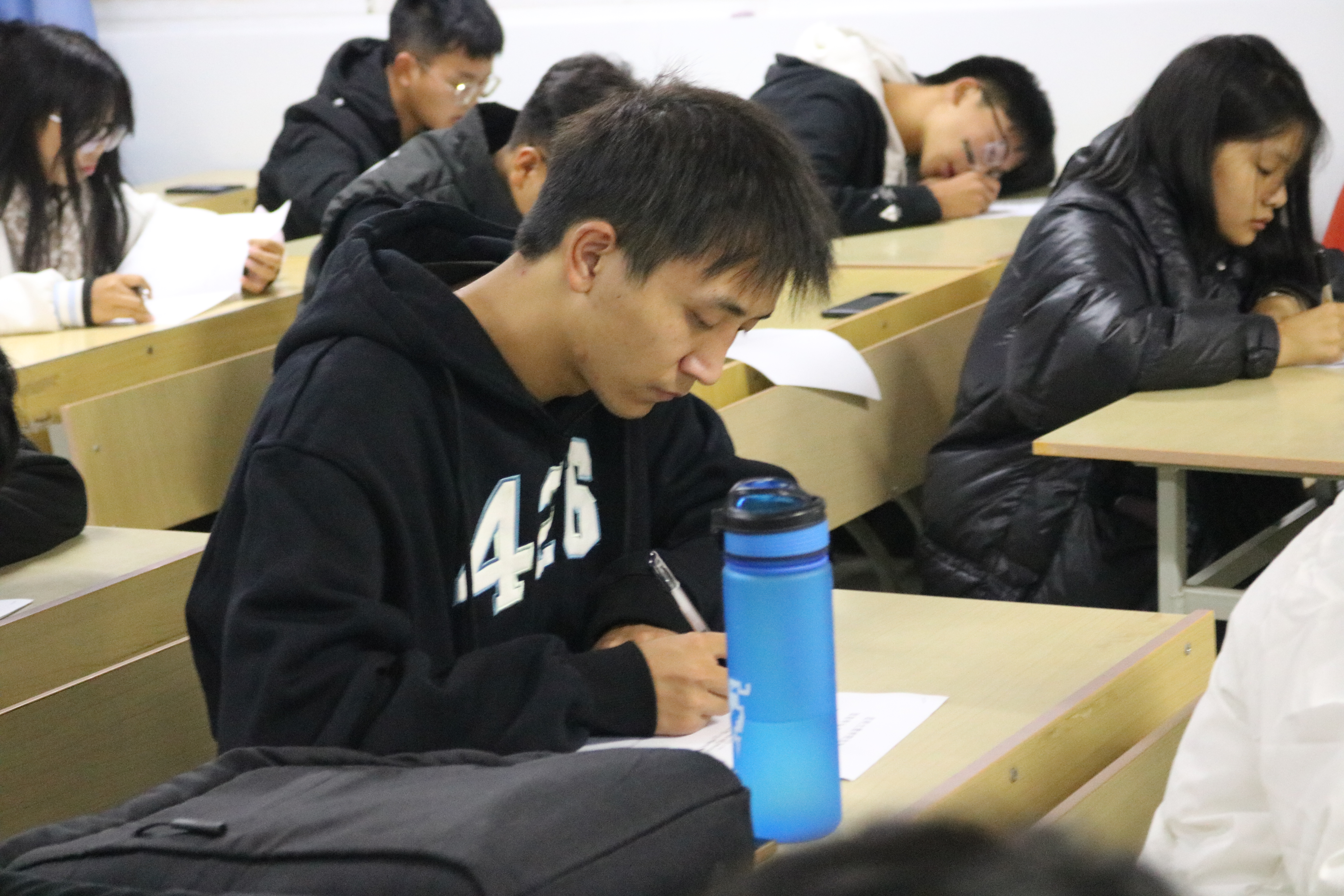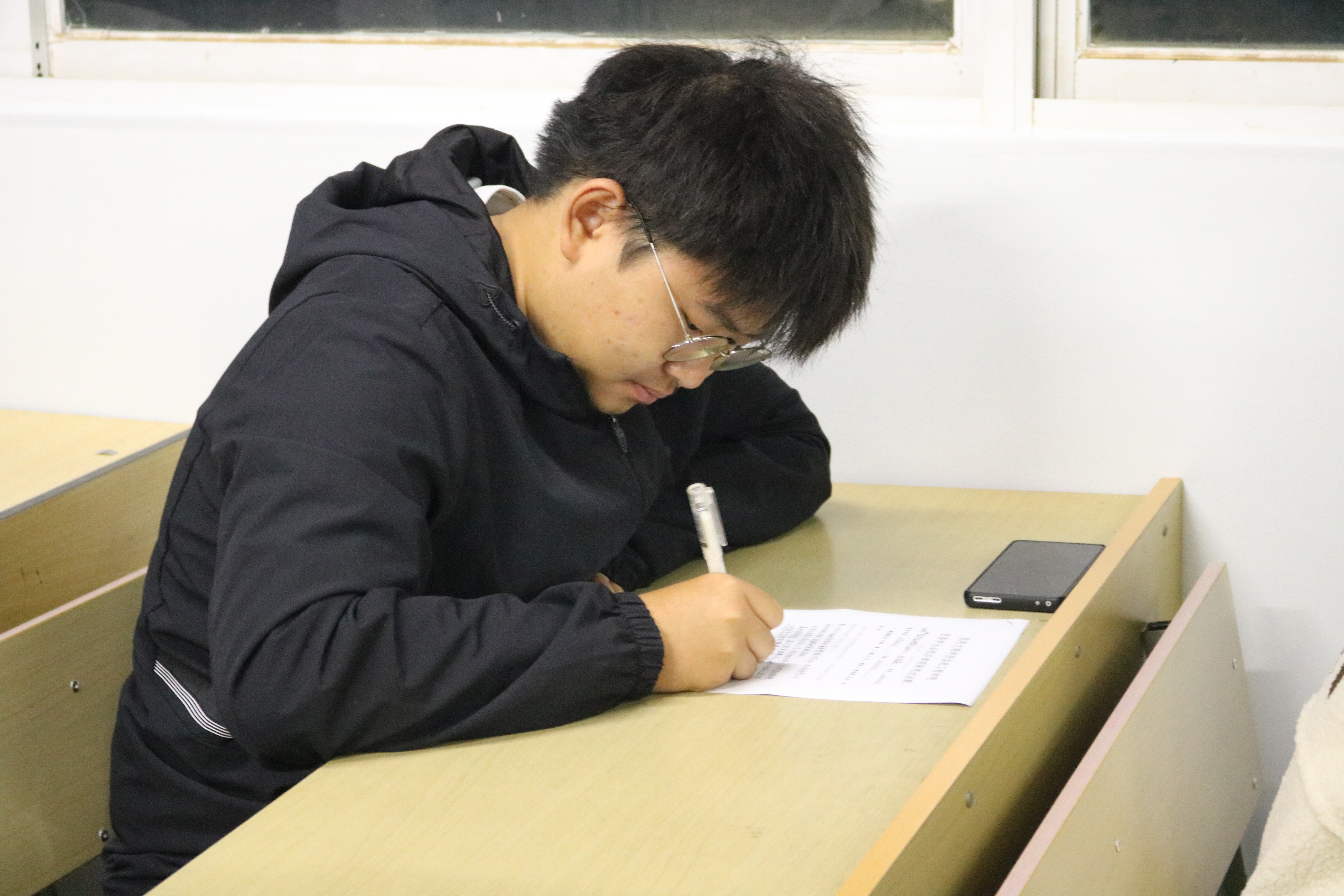 本次的考试进行中每一位学生都非常认真的对待此次考试,严谨认真的作答每一题,没有一人出现交头接耳,扰乱考场秩序的现象。学生会的干部们也是一直在认真地监考,以便及时发现问题并作出改正。