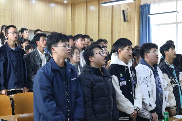 大会伊始,在主持人组织部部长黄志鹏的带领下全体起立奏唱团歌。全体人员庄严肃立,每个人脸上都洋溢着青年的豪情与壮志。唱团歌不仅仅只是一个流程,他有利于进一步加强团员意识教育,增强团组织的凝聚力 和战斗力,不断对青年进行教育和引导,增强青年的民族自尊、自信和自强精神,树立正确的理想、信念和世界观、人生观 、价值观。不断提高青年的思想道德素质和科学文化素质。习近平总书记曾对青年寄语“青年强则国家强,当代中国青年生逢其时,施展才干的舞台无比广阔,实现梦想的前景无比光明。”面对时代赋予的使命,我们应该奋勇前行,艰苦奋斗。