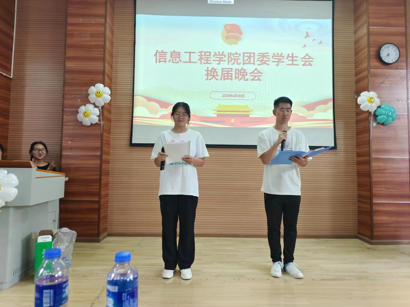 时光荏苒,岁月如梭。信息工程学院团委学生会于2023年6月30日18:30在C216教室举行换届晚会。莅临本次晚会的嘉宾信息工程学院数学与应用数学教研主任刘雅丽老师,信息工程学院专职组织委田津老师,信息工程学院团委书记颜玲瑛老师,信息工程学院专职辅导员黄容老师。由新媒体运营部副部长李泽宇和体育部部长杨宋敏主持。此次大会共有七项议程。