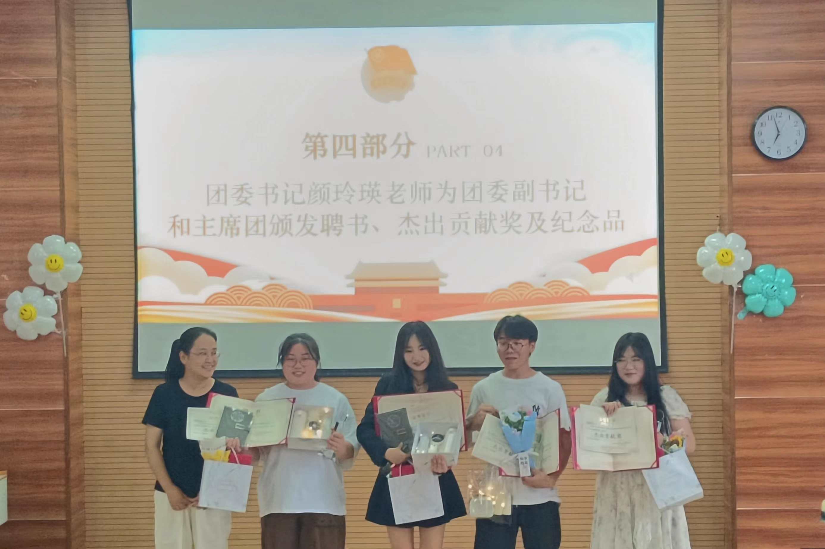 大会第四项,团委书记颜玲瑛老师为团委副书记和主席团颁发聘书、杰出贡献奖及纪念品