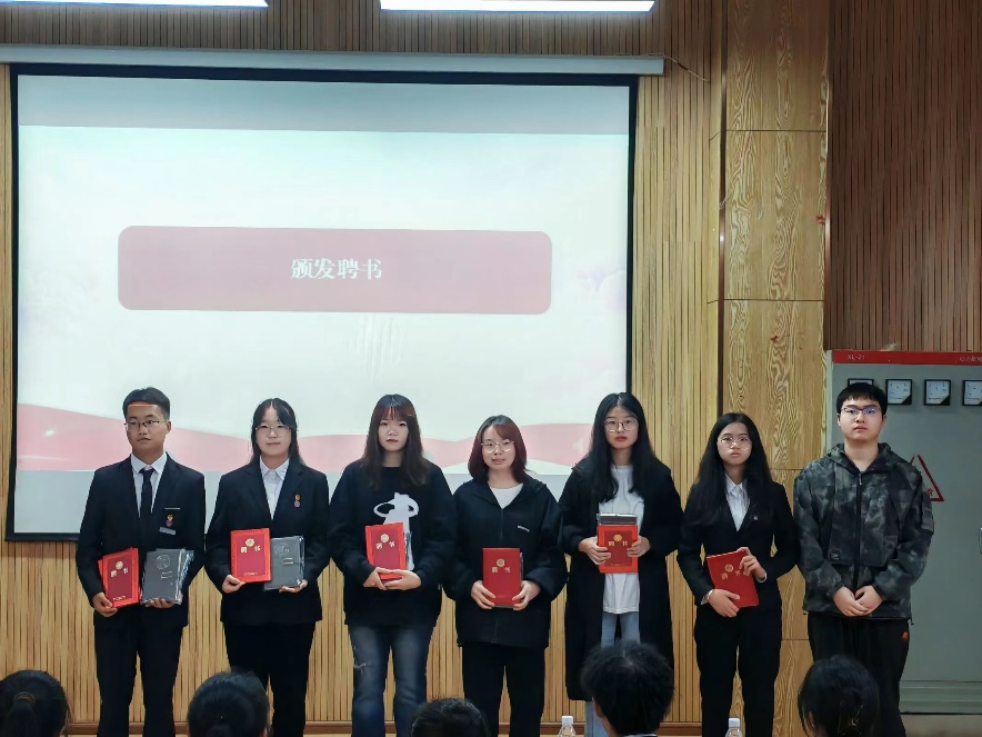 大会第二项议程:颁发聘书。此议程由信息工程学院团委学生会各位主席带领各部门前任部长给各部门新任部长颁发聘书,既是对新任部长工作能力的肯定,也是新旧部长之间全心全意为同学服务精神的传承。