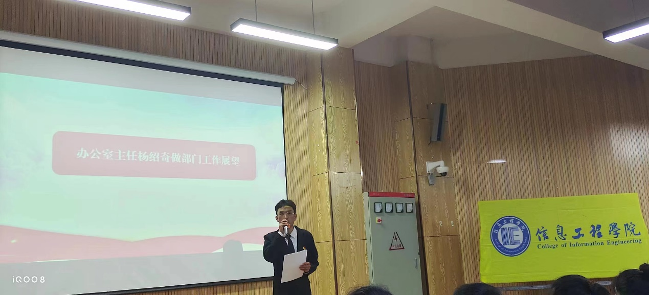 大会第七项议程:信息工程学院各部门部长上台做工作展望。每个部门合在一起组成了信息工程学院团委学生会这个大家庭,这个大家庭的正常工作离不开每个部门的团结协作,各部门部长对自己部门的工作计划安排细致入微,充满激情,斗志昂扬。