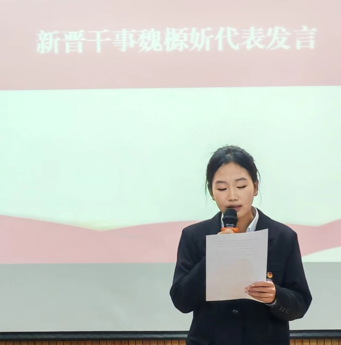 大会第八项议程:新晋干事代表魏榞妡发言、新晋干事张龙带领宣誓。他们的脸上都洋溢着自豪和自信,他们的态度代表了全体新晋干事的积极向上的工作态度。
