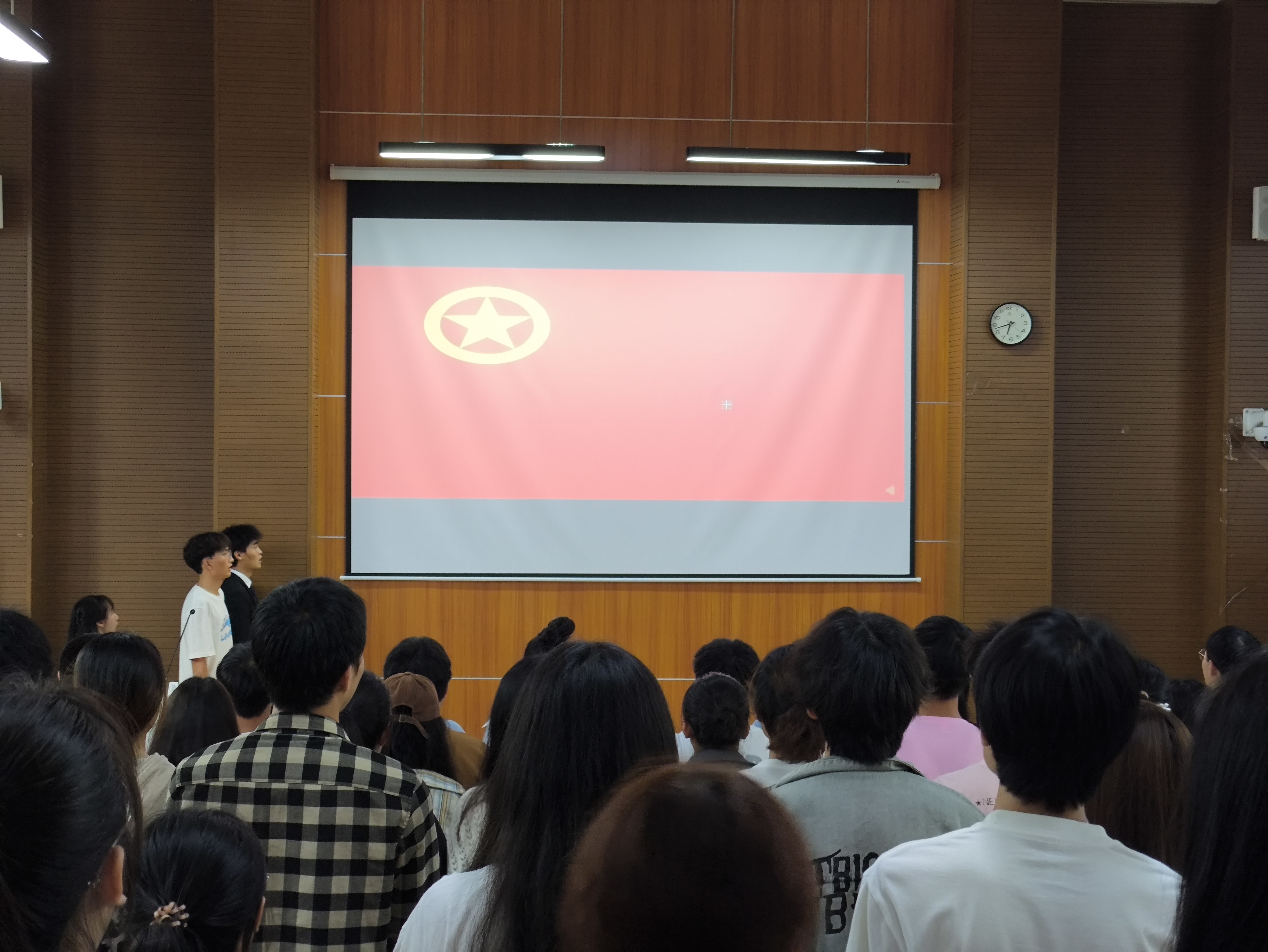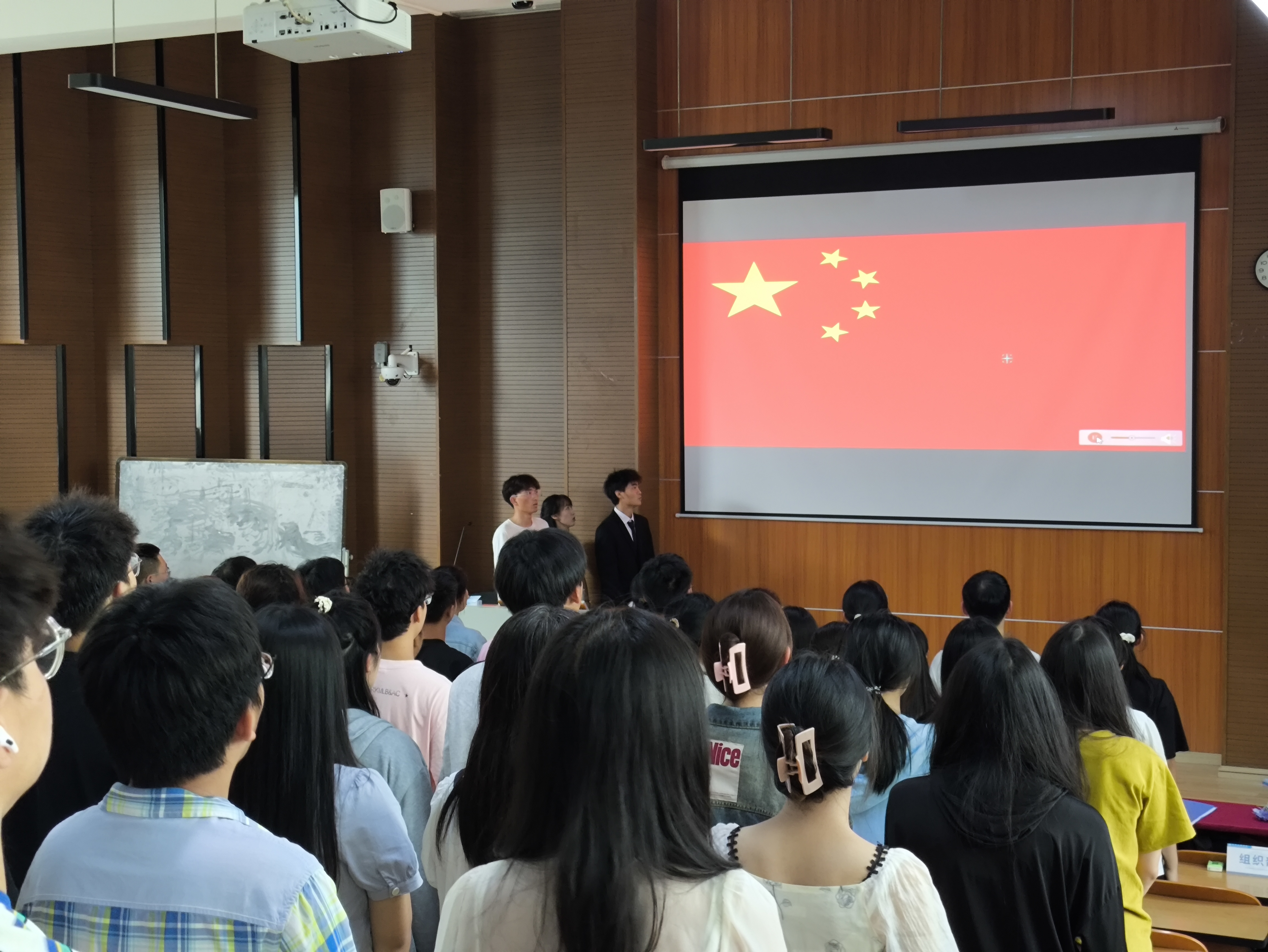 大会第一项议程,全体奏唱国歌。本次大会在庄严的国歌声中开始,全体师生齐唱国歌,行注目礼。国歌《义勇军进行曲》中蕴含着不屈不挠,勇往直前的精神。
