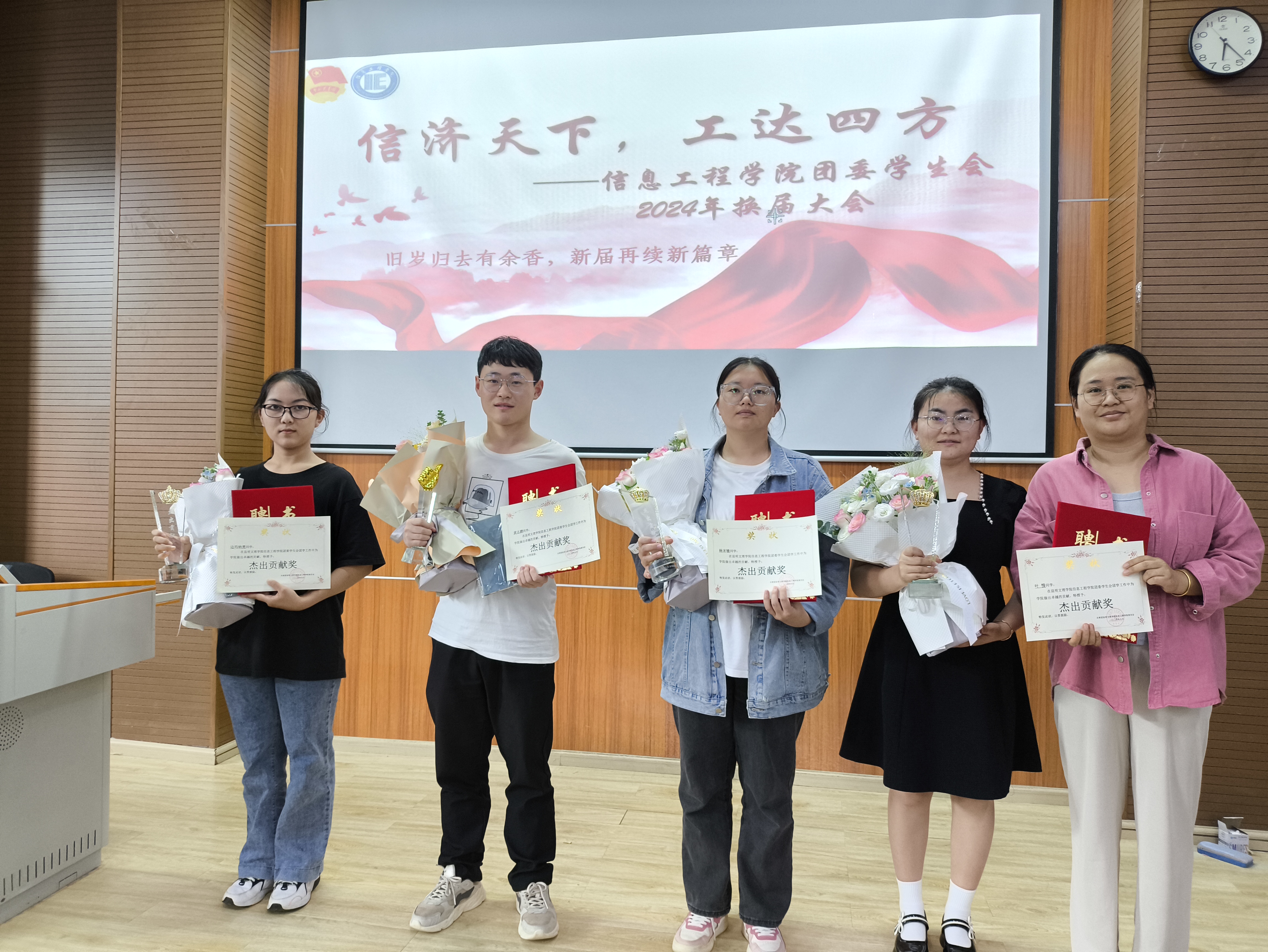 大会第三项议程,颁发聘书。对信息工程学院团委副书记黄志鹏、信息工程学院执行主席叶慢、信息工程学院团委学生会主席边玛纳楚、杨宋敏颁发“杰出贡献奖”并颁发聘书以及纪念品。