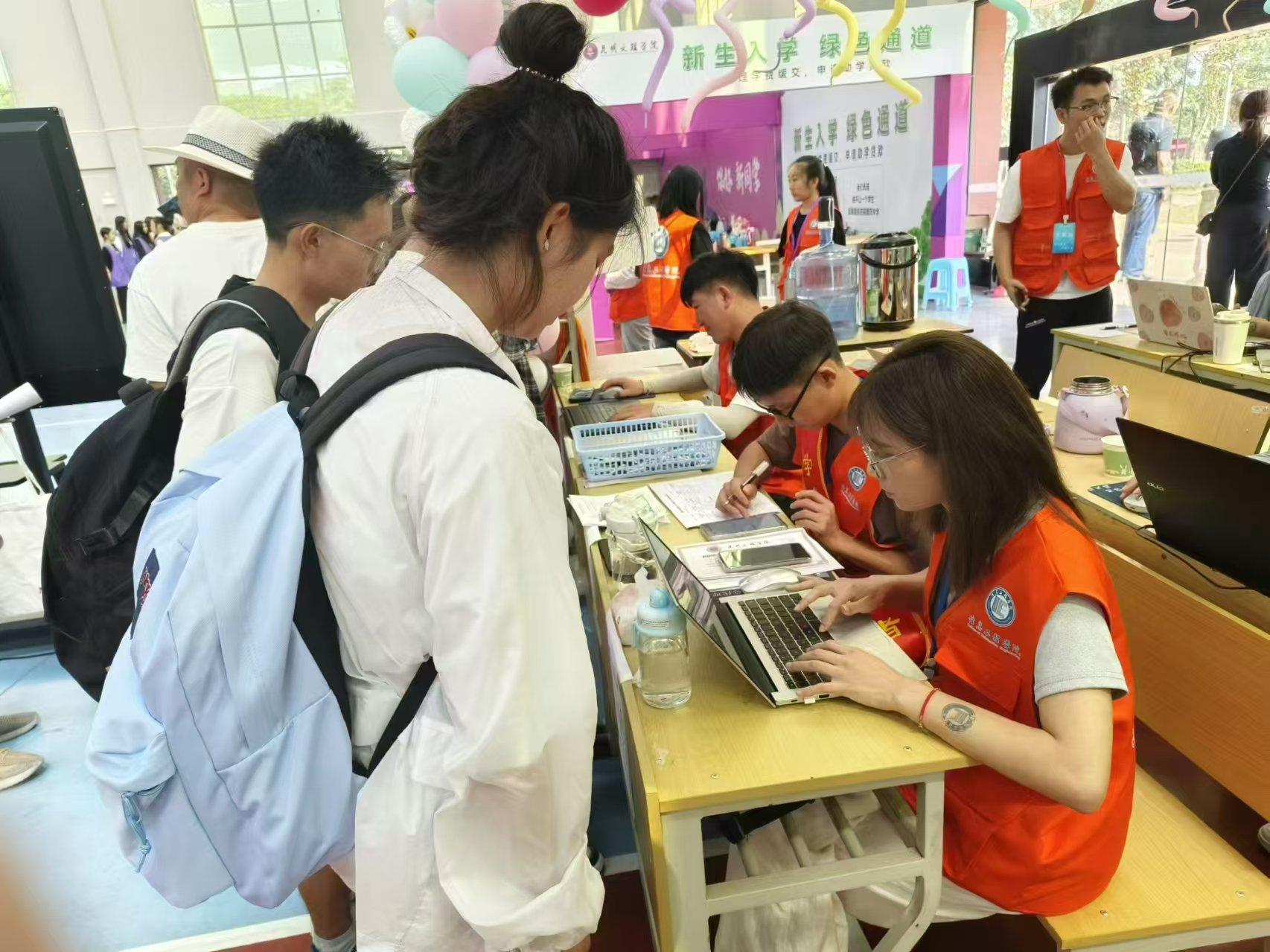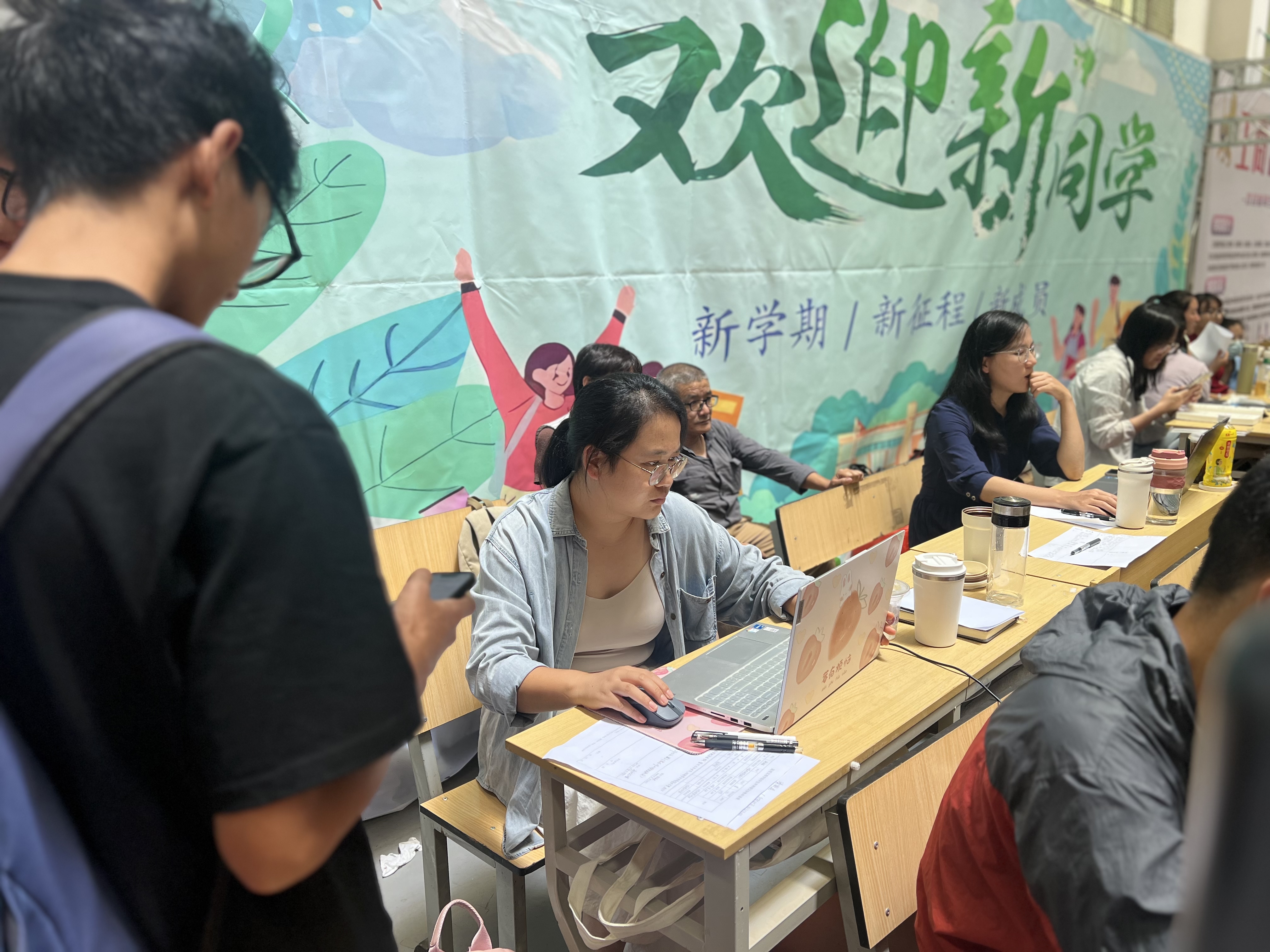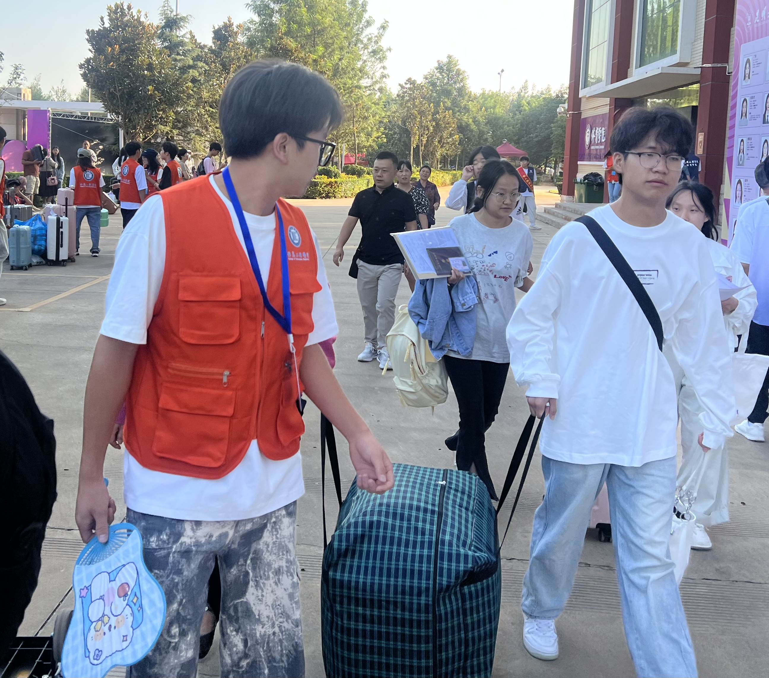 清晨,学院的老师和志愿者们就早早地来到了迎新现场,准备以最饱满的热情迎接新生的到来。他们分布在各个岗位,有的在校园门口引导新生找到报到地点,有的在报到点耐心地为新生办理入学手续,还有的帮忙搬运行李,解答新生和家长们的各种疑问。