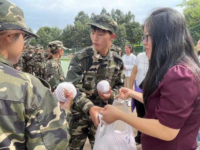 活动当天,学院的老师们带着满载苹果的袋子,来到了军训场地。他们将苹果一一分发给正在训练的新生们,并亲切地与他们交流,了解他们的训练情况和身体状况。老师们表示,军训虽然辛苦,但也是成长的重要阶段,希望同学们能够珍惜这个机会,锻炼自己的意志和体魄。
