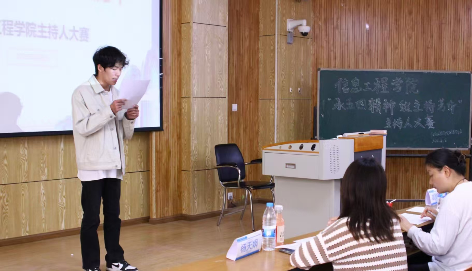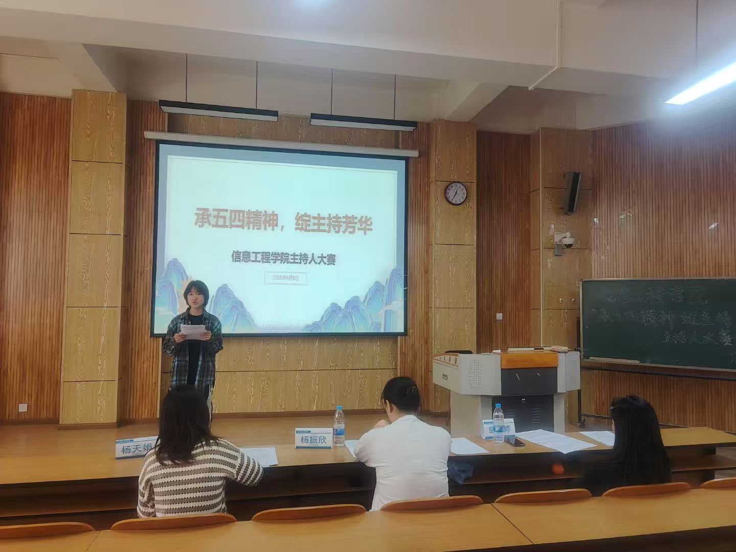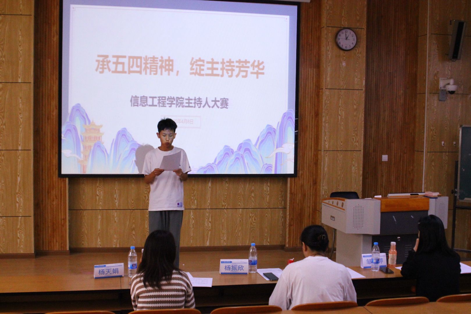 为传承五四精神,展现同学们的语言风采,信息工程院于2025年4月8日在昆明文理学院C113教室举办了以“承五四精神,绽主持芳华”为主题的主持人大赛。出席本次比赛的老师有邹梦婷老师,杨振欣老师,杨天娟老师。在本次比赛当中,同学们展现出了一场思想跨度与艺术魅力的盛宴,充分展现出语言的魅力,也充分展现了同学们的思想内核。