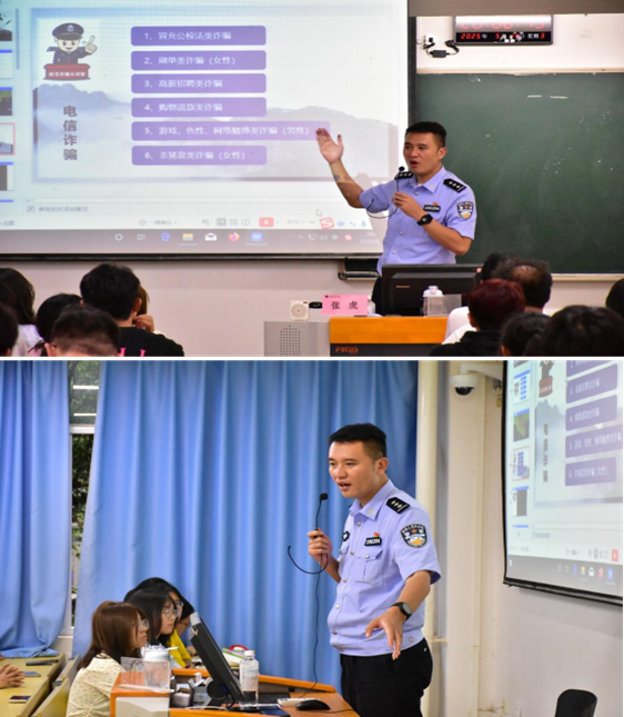 讲座中,张虎警官结合当前电信网络诈骗的发案特点,全面分析了常见的诈骗类型及作案手法,并通过真实案例深入浅出地揭露了诈骗分子的惯用伎俩。他指出,大学生社会阅历较少,是电信网络诈骗的易受害群体,强调需从三方面强化防范工作:一是加强思想引导,帮助学生树立正确的世界观、人生观、价值观;二是常态化开展预防电信网络诈骗主题教育,提升学生风险防范能力;三是创新教育形式,以宿舍为单元开展反诈交流,营造全员参与的宣传氛围。