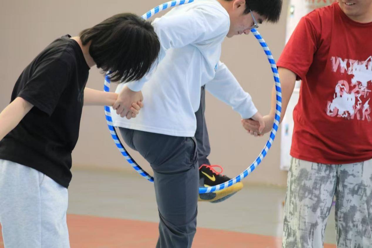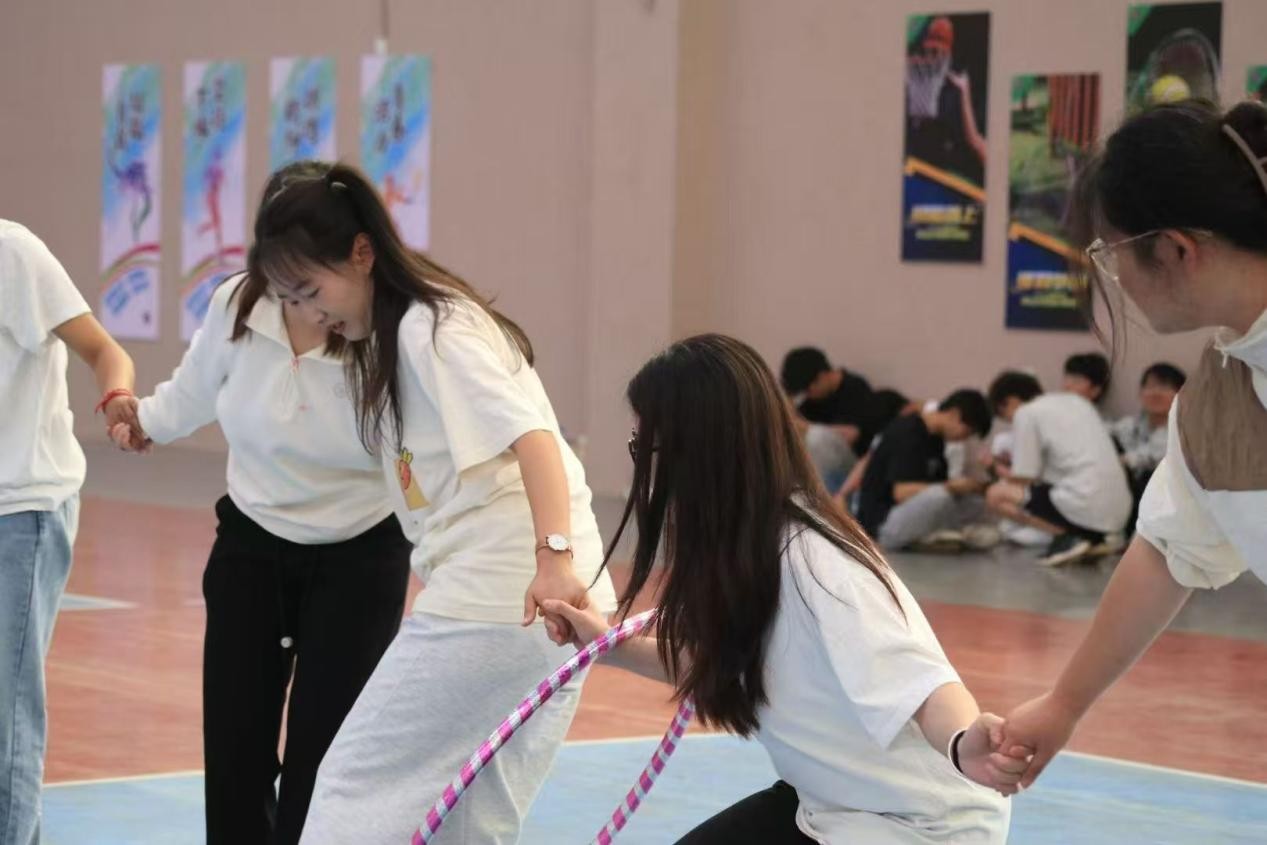 在呼啦圈传送比赛中,每组派出 10 个人,团队成员排成一列,手拉手传递呼啦圈,由第一个人传至最后一个人,又传到第一个人的地方呼啦圈落地,即计时结束。在比赛过程中,各组成员相互配合,小心翼翼地传递着呼啦圈。此项比赛则考验了团队成员之间的信任与协作。