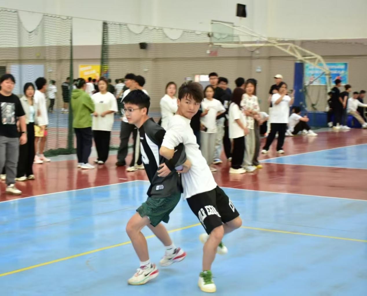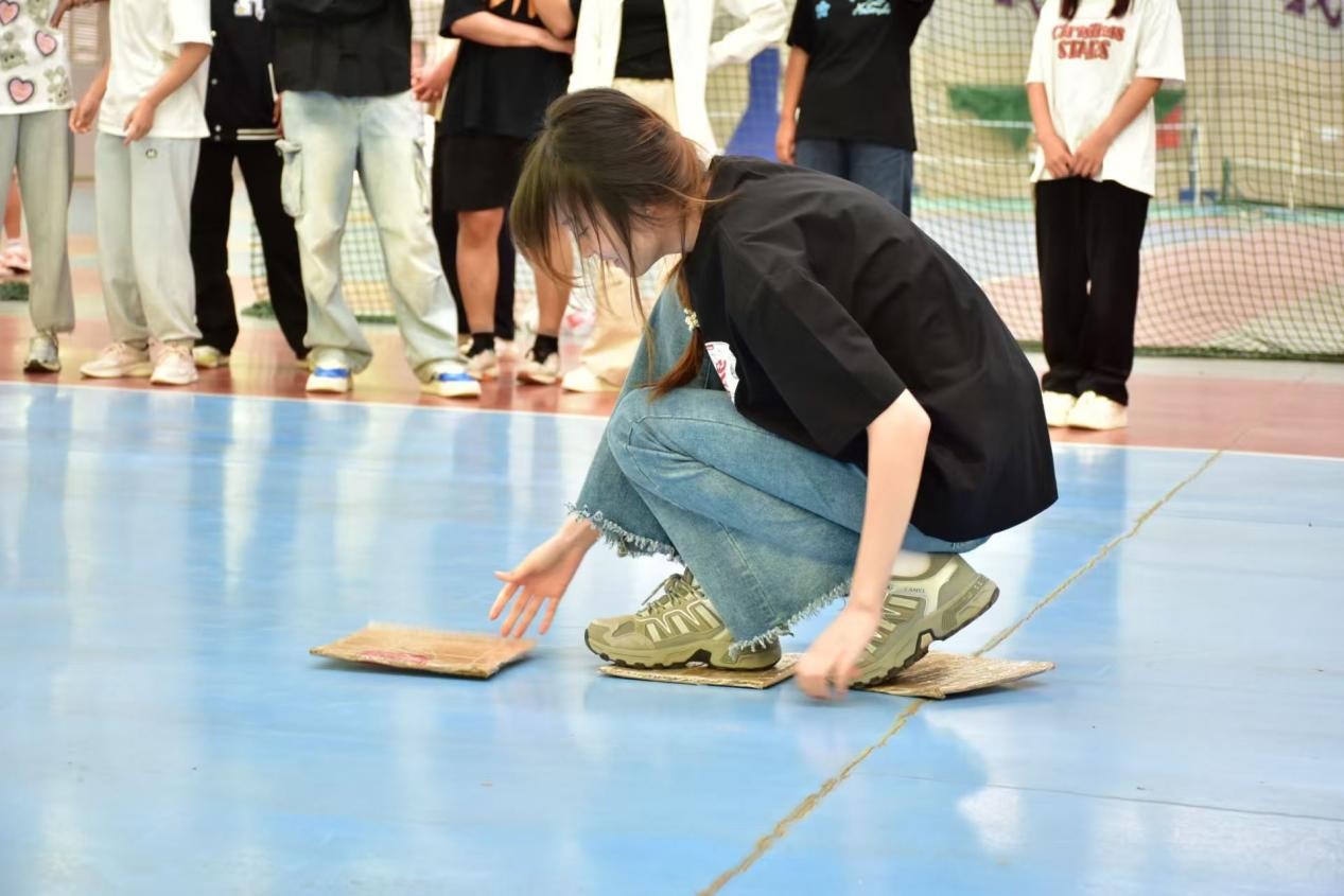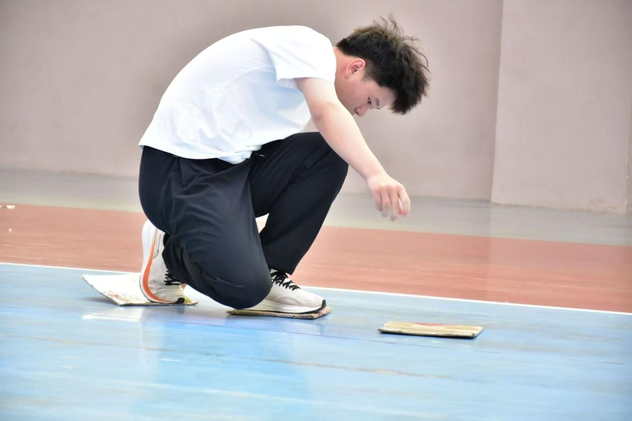 在摸石过河项目中,每组派出 4 人,其中 2 人站在起点,另外 2 人站在终点。玩家站在起点线后,将三块“石头”放在身前的地面上,玩家依次将“石头”向前移动,每次只能移动一块,且脚要踩在“石头”上,不能踩地。过程中身体任何部位不能触碰地面,若触碰则需回到上一个“石头”所在位置重新前进。从起点出发到终点的最后一人回到起点即计时结束。比赛过程中,同学们小心翼翼地移动“石头”,比赛现场一片欢腾,观众们的加油助威声震耳欲聋。