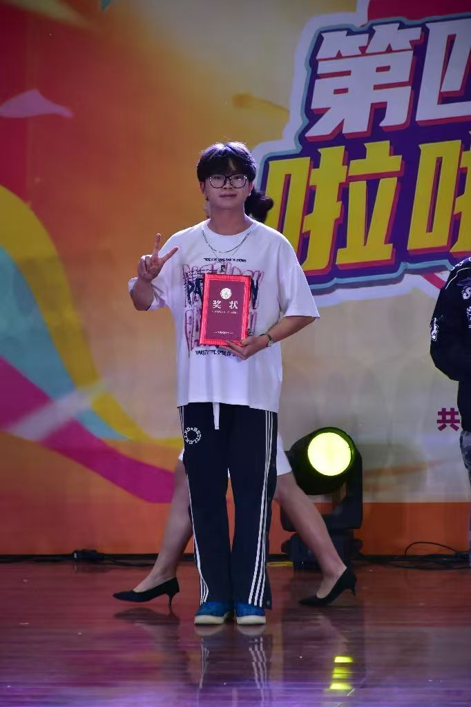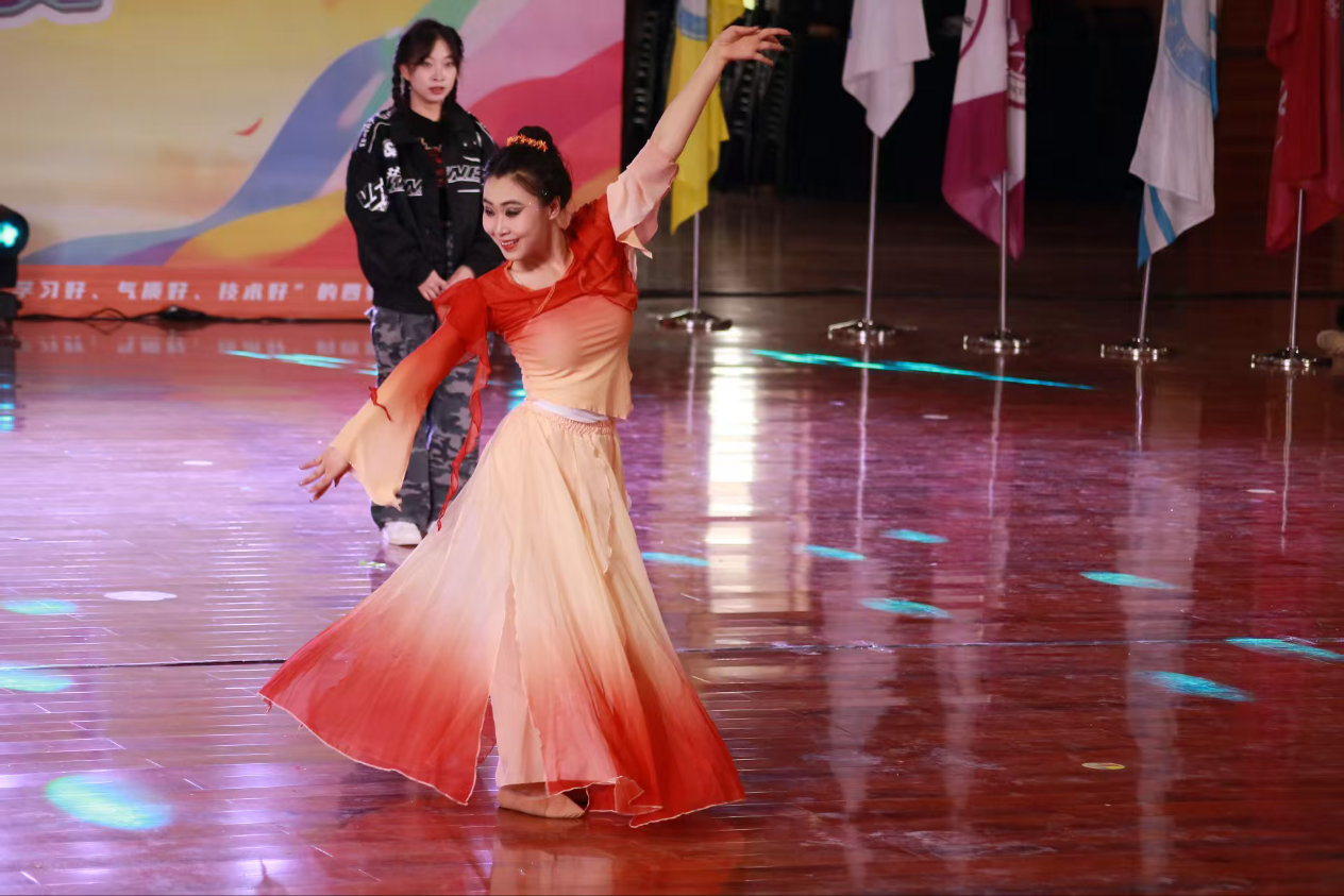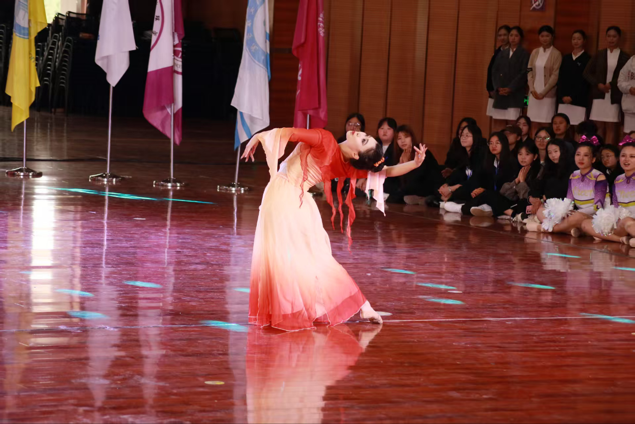 大赛最后一个环节是啦啦操队长PK,王砚晰同学作为信息工程学院的啦啦操队长参与了此项环节。在赛台上,王砚晰同学的手臂轻柔地摆动,每一个动作都仿佛经过精心雕琢,却又毫无雕琢之感。这种美感不仅体现在动作的优美上,更在于它所传达出的内在情感和意境。