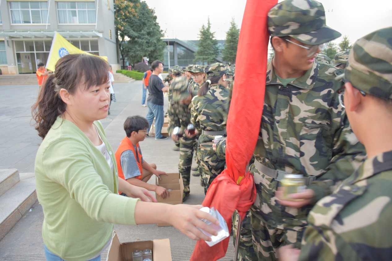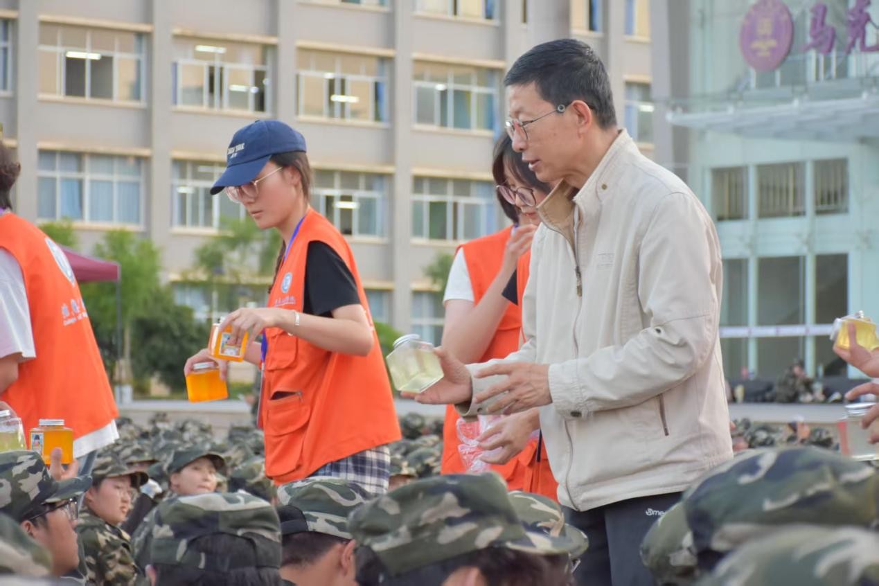 当天,信息工程学院团委学生会成员提前采购新鲜葡萄、柠檬、橘子等食材,调配了酸甜橘子汁、香浓奶茶、葡萄椰果水、清爽百香果柠檬水,每一杯饮品都装满了对新生的关怀。学院院长刘敏昆老师,副院长吴晟老师、李宇亮老师、熊龙老师,院长助理刘瑞娟老师以及学院辅导员代表来到训练场,亲手将解暑饮品递到新生手中,同学们接过饮品,脸上露出爽朗的笑容,训练带来的疲惫也消散了不少。