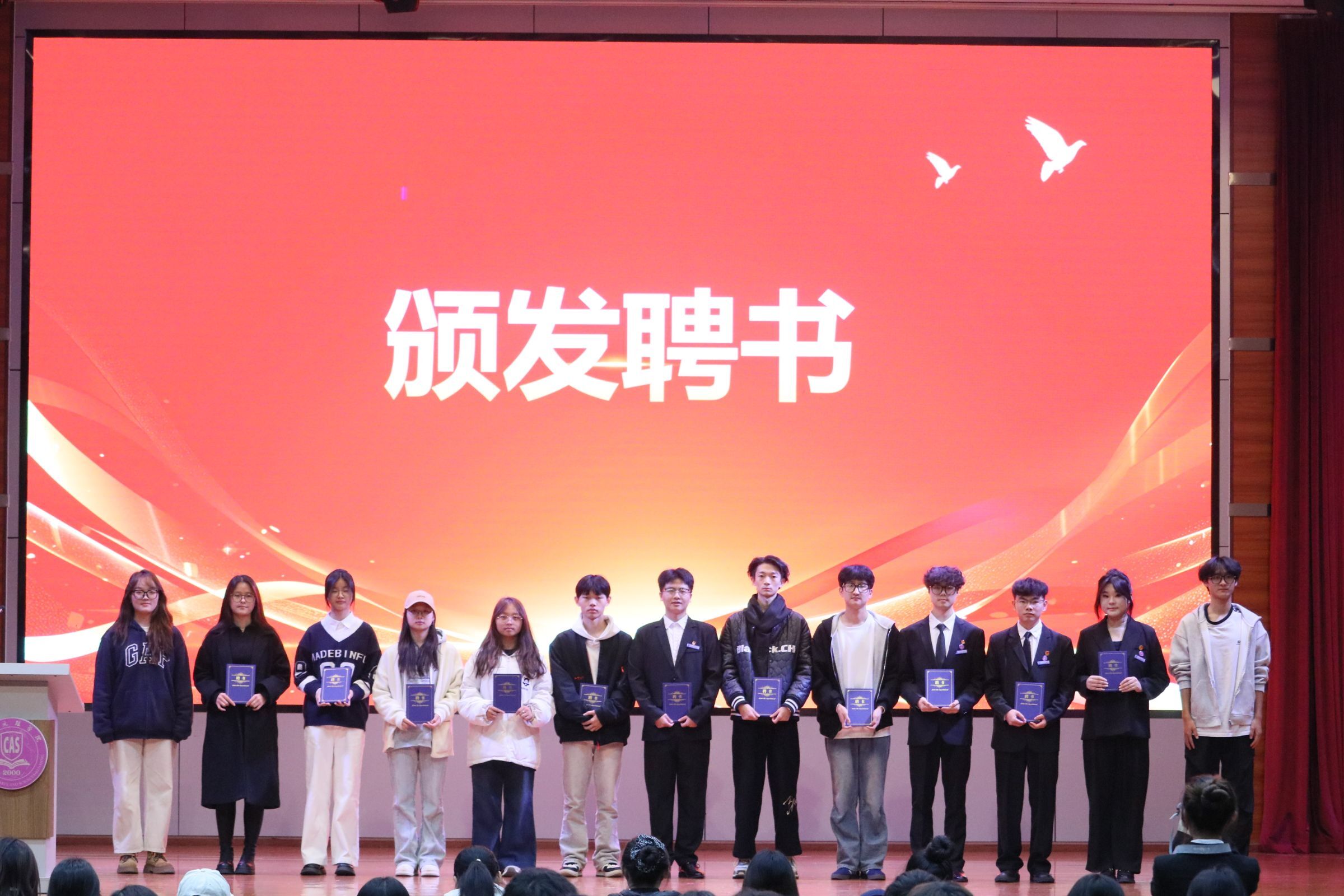大会第六项,颁发工作牌。信息工程学院团委书记颜玲瑛老师和信息工程学院党总支宣传委员黄容老师以及信息工程学院专职辅导员金丽娟、杨天娟老师给新进部长颁发专属工作牌,再由各部长副部长给各部门新进干事颁发工作牌,牌面印刻职责标识,既象征身份与使命,也开启他们以青春之力服务校园的新征程。
