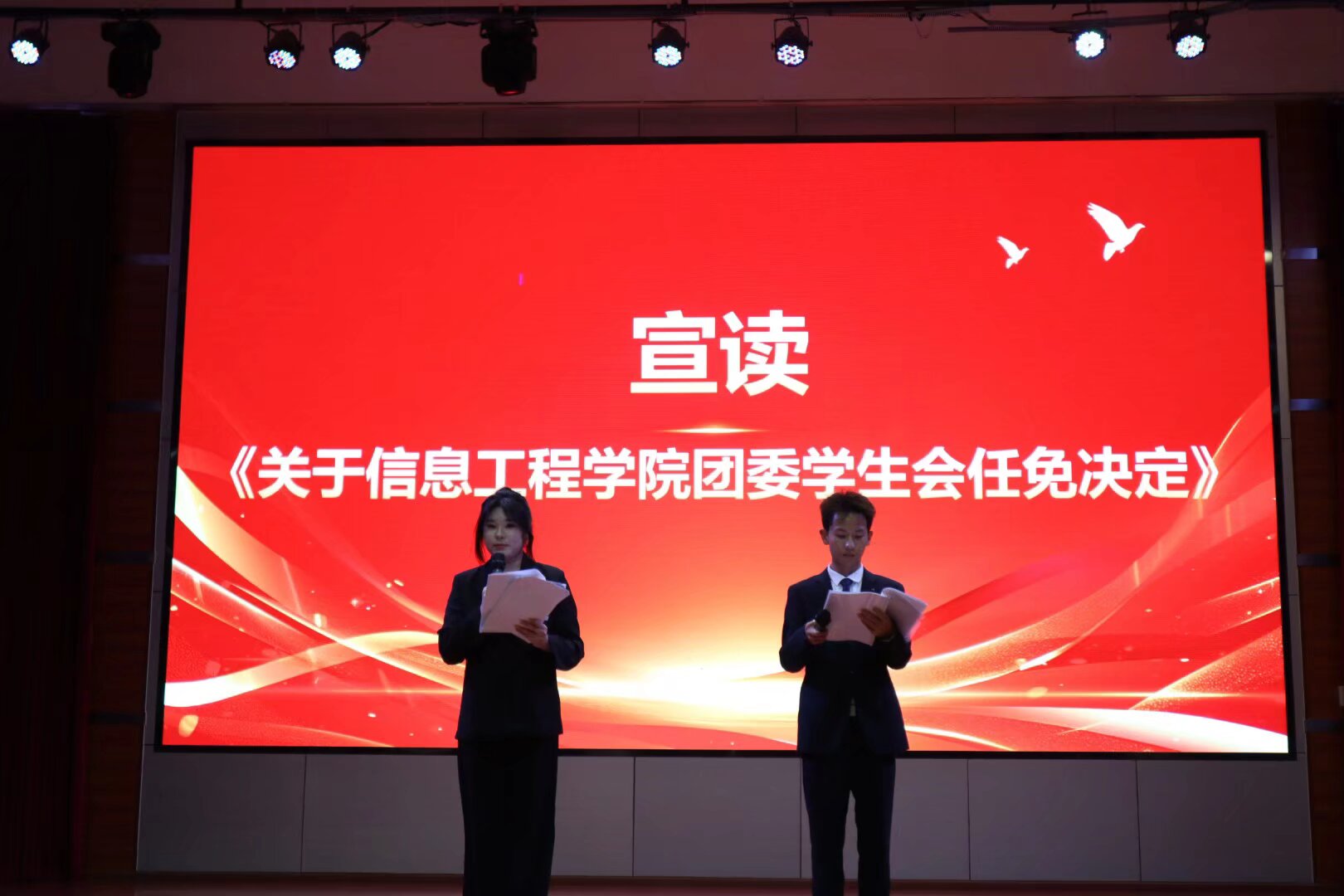 大会第三项,主持人宣读《关于信息工程学院团委学生会的任免决定》,感激任期已满的干部们在过去一年为信息工程学院的辛勤付出,祝愿他们在今后的日子里更加闪闪发光,不断实现自己的理想以及自身的价值。同时期待新干事们在工作中学会团队协作,不断磨炼自我,为信息工程学院贡献自己的一份力。