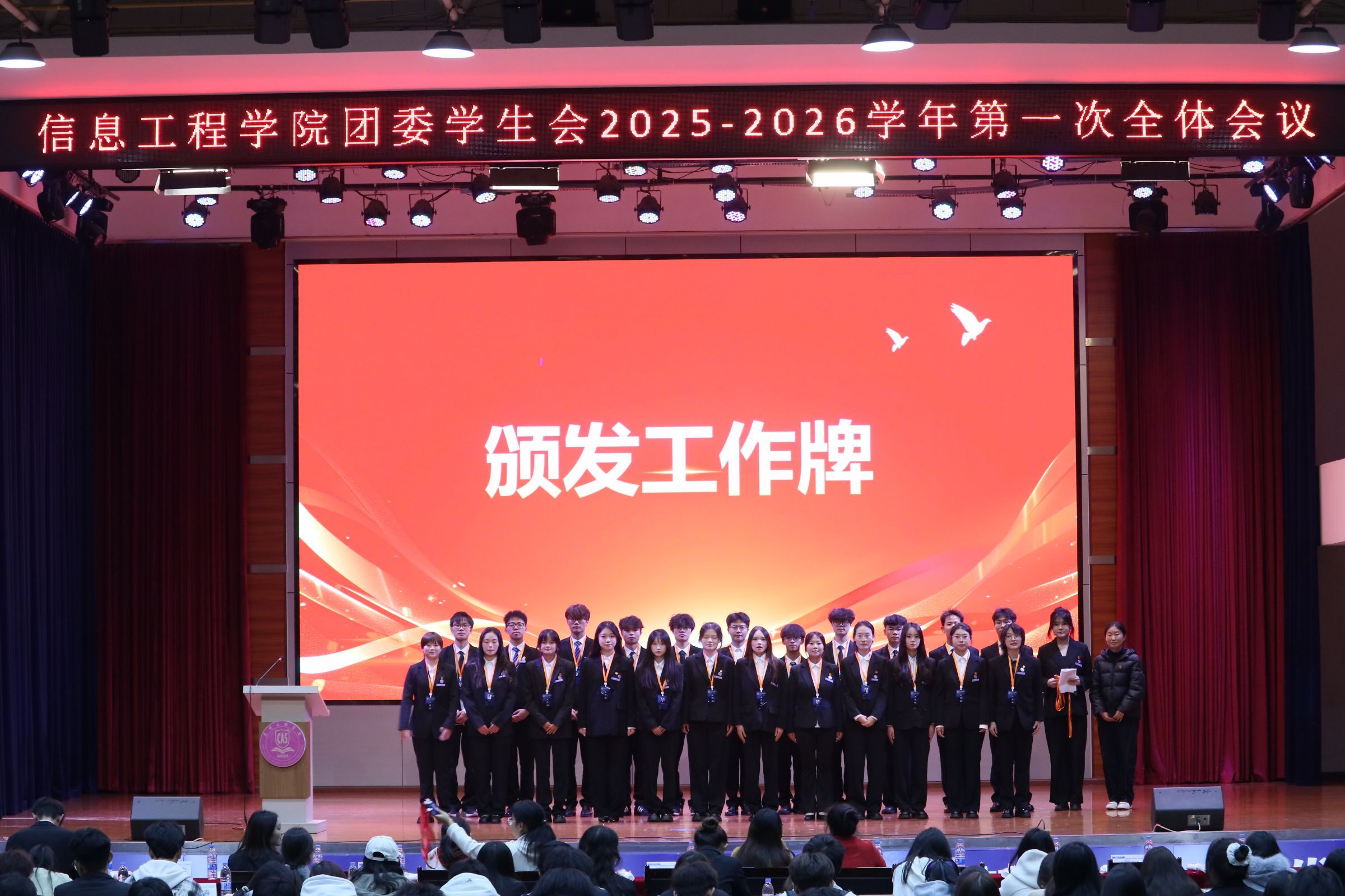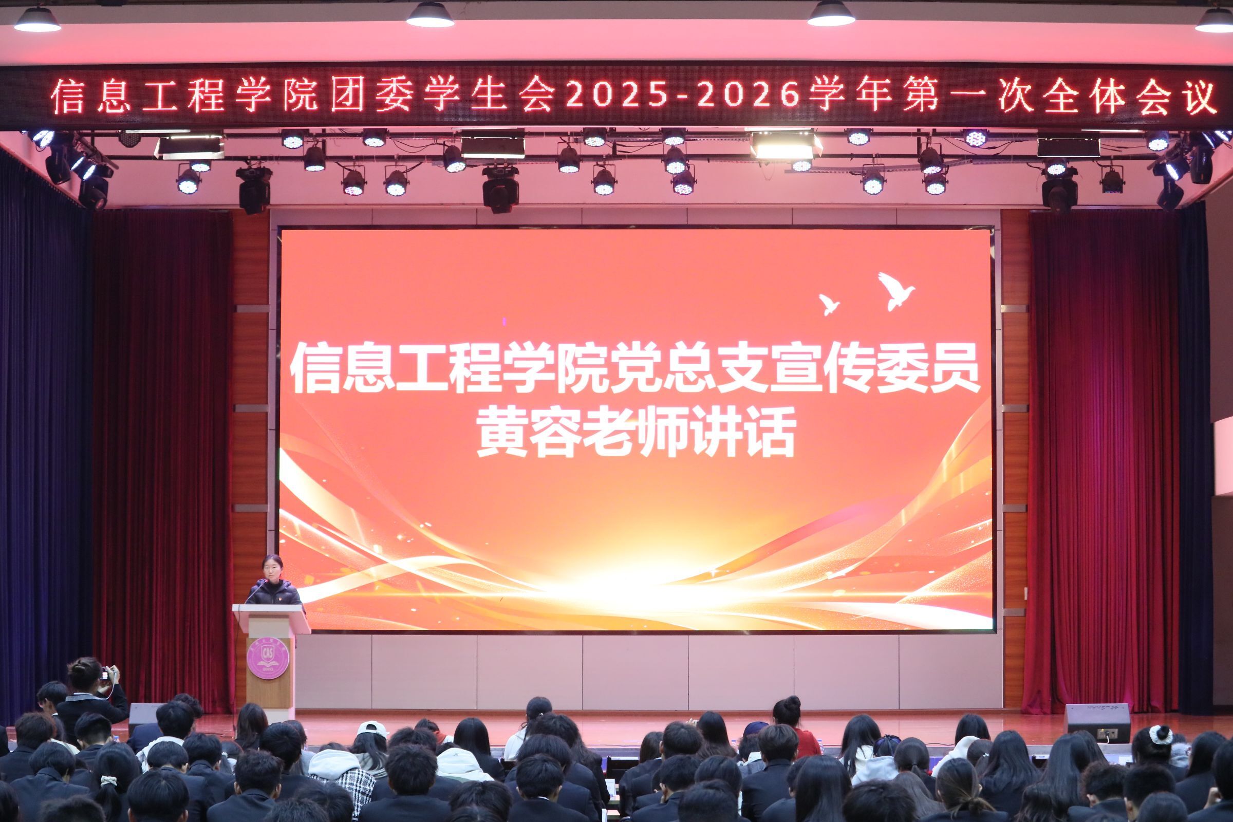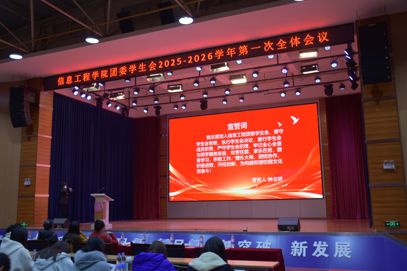 2025年10月23日星期四,信息工程学院团委学生会全委会于杨林校区报告厅隆重举行。 大会以“承初心·启新程·聚青春·赴未来”为主题,旨在选拔政治素质过硬、工作能力突出、服务意识强烈的学生骨干,为学生会注入新鲜血液,持续推动校园文化建设与学生服务工作高质量发展。