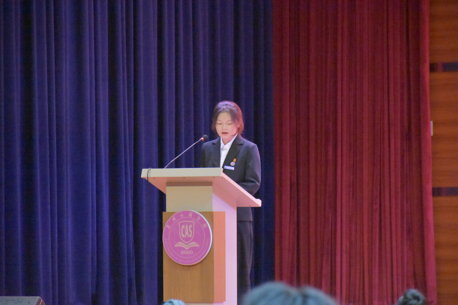大会第十一项,主席陈致源发言, 陈致源学长提出,学生会是链接学院与同学的桥梁,期望成员以探索创新精神对待工作,视职责为事业,在挑战中践行优秀。