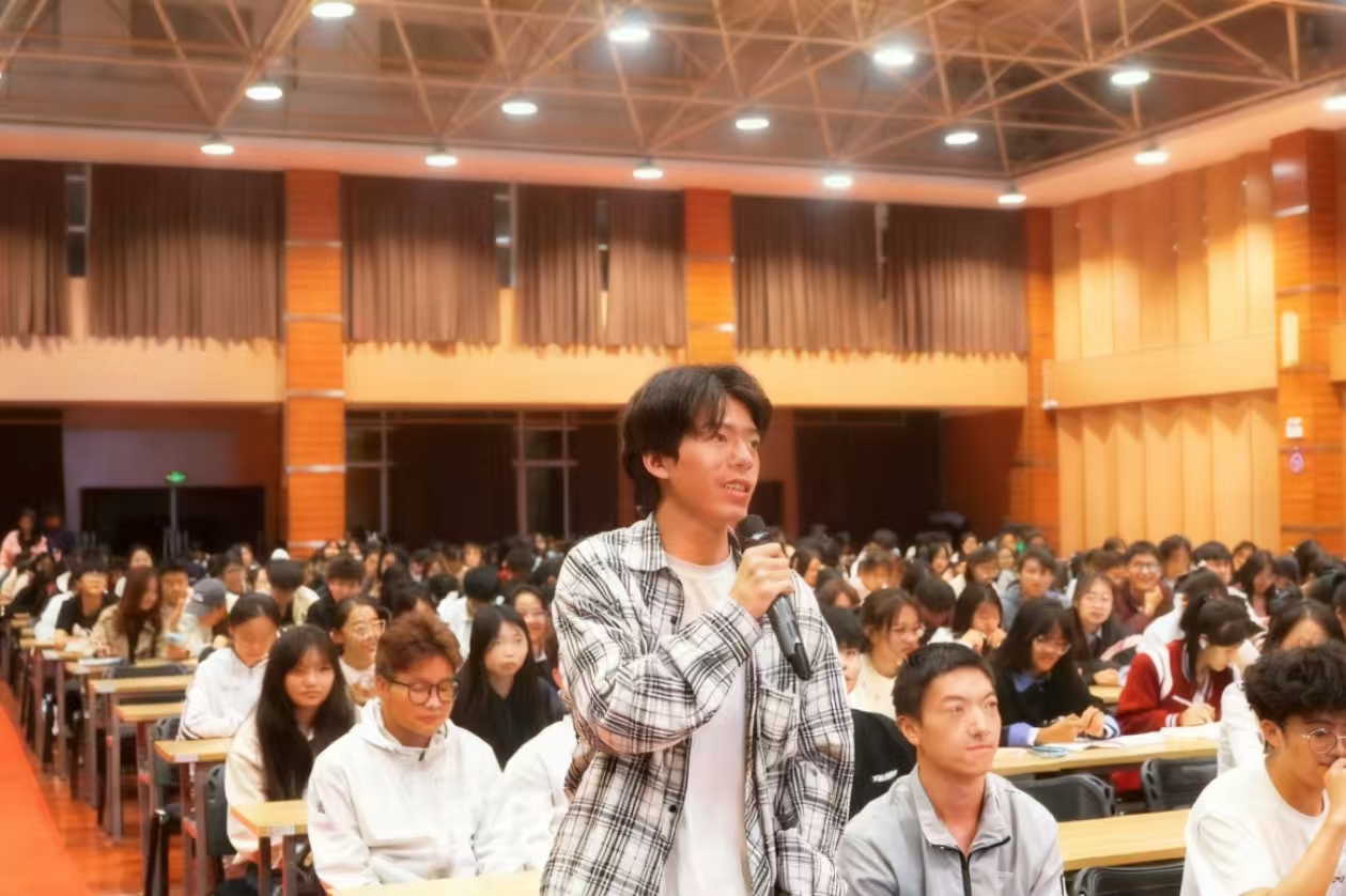 同学们围绕竞赛备赛、科研选题中的建模难题积极提问,吴晟老师结合自身多年指导经验逐一解答,现场交流氛围热烈。提问过程中, 同学们围绕“用逻辑解码现实世界 ”等实际问题展开深入交流。大家结合课堂所学的数学知识 , 积极分享自 己的建模思路,有的同学提出用线性规划方法构建模型框架,有的则建议通过数据分析优化参数设置,现场不时响起阵阵掌声。针对讨论中出现的分歧, 同学们各抒己见、相互辩驳,在思想的碰撞中逐渐明晰解题方向,进一步完善了建模方案。