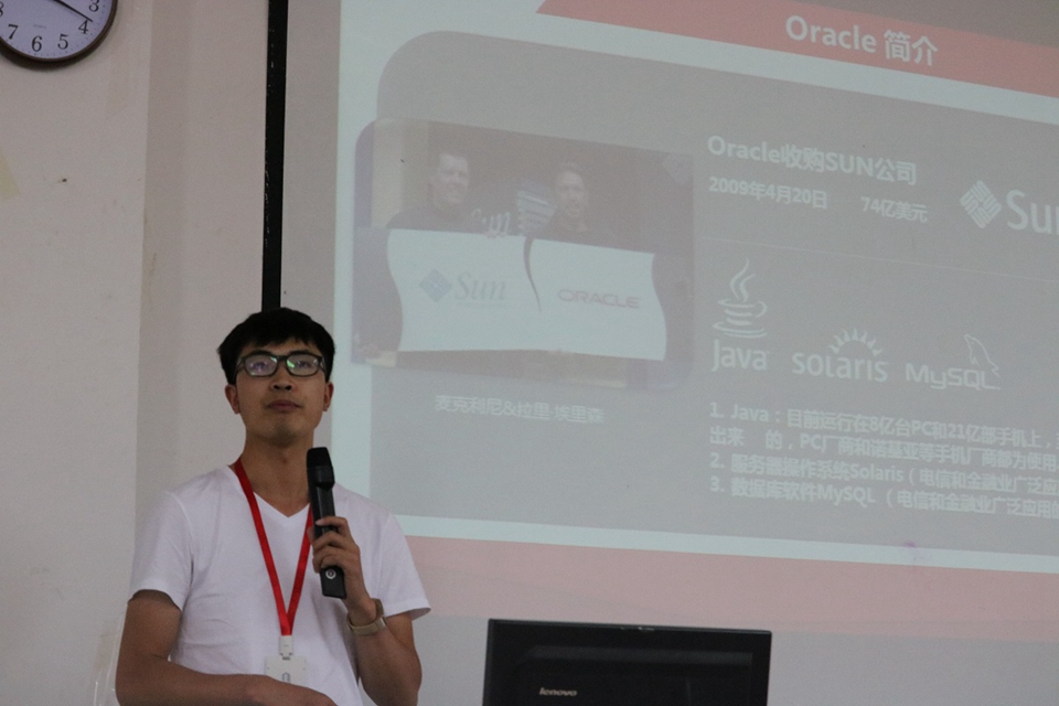 讲座先介绍了主讲公司的概况,甲骨文股份有限公司(Oracle)是全球大型数据库软件公司,公司开发的Java,目前运行在8亿台PC和21亿部手机上,至少50%的网页是用Java语言写出来的,PC厂商和诺基亚等手机厂商都为使用Java支付版权税;电信和金融业广泛应用的服务器操作系统Solaris、数据库软件MySQL 均由甲骨文股份有限公司开发。